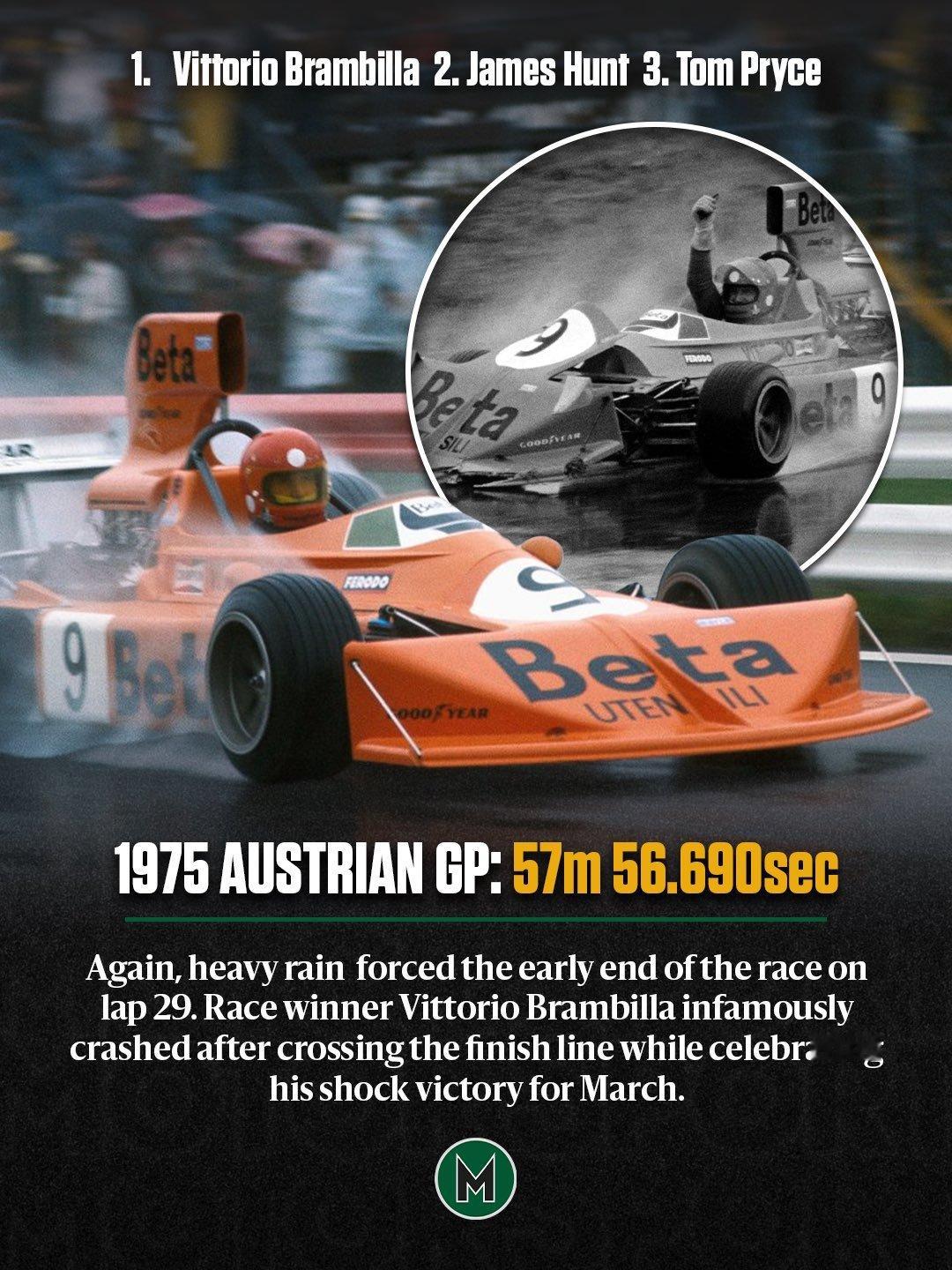 同样因为大雨,1975年的奥地利大奖赛只跑了29圈就提前结束,当时效力Beta Team March意大利车手维托里奥·布兰比拉领先詹姆斯·亨特27秒赢下了比赛,拿到了自己F1生涯里的唯一一胜,不过在回场圈时他却把车给撞了。