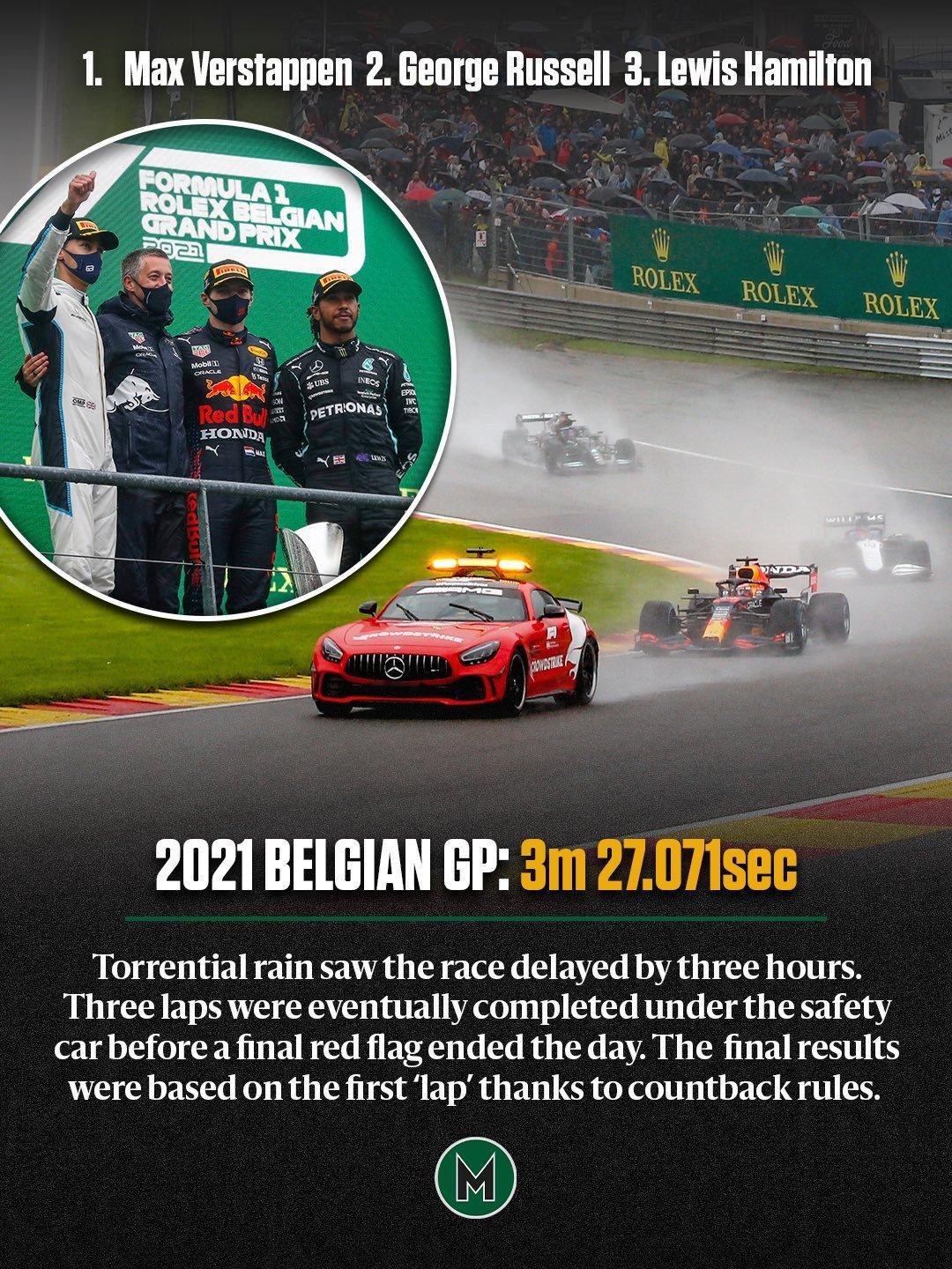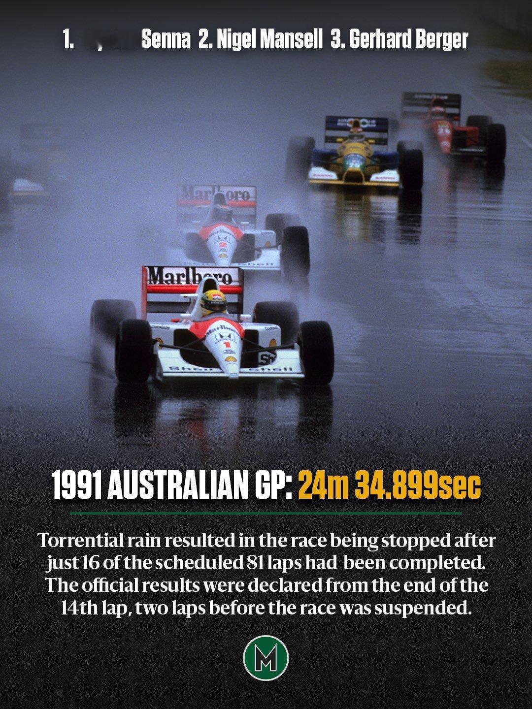 因为大雨的原因,1991赛季的收官战澳大利亚大奖赛只跑了16圈就宣告比赛终结,成绩则是根据规则按第14圈完成时计算。这其实是F1史上在正式开跑后用时最短结束的比赛,毕竟2021的比利时都是安全车在带。至于最后的结果,提前赢下当年车手世界冠军的塞纳拿到了冠军,亚军和季军分别是曼塞尔跟博格。
