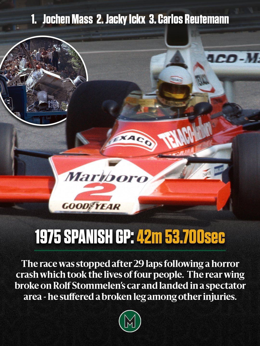 1975年的西班牙大奖赛是当年F1第四回合的比赛,在西班牙巴塞罗那的蒙特惠奇赛道举行。原地75圈的比赛在进行到第29圈时就宣告终结,因为德国车手罗尔夫·斯托梅伦的赛车尾翼断裂导致失控撞车,结果赛车与护栏碰撞后弹向了观众区,结果导致了四人的死亡。