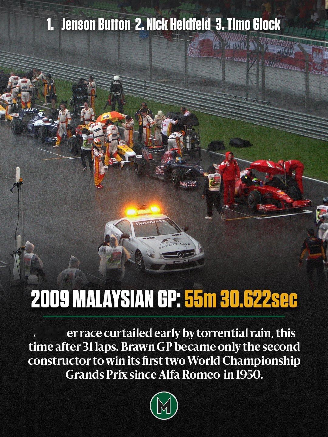 2009年的马来西亚大奖赛估计也是很多人都有印象的一场,飘忽的降雨最终让比赛跑了31圈后就提早结束,当时效力布朗GP车队的巴顿拿到冠军,而布朗GP车队也成了继阿尔法·罗密欧之后第二家在参加F1世锦赛头两场比赛里都获胜的制造商。当然,那场的另一个名场面就是Kimi吃梦龙了。[doge]