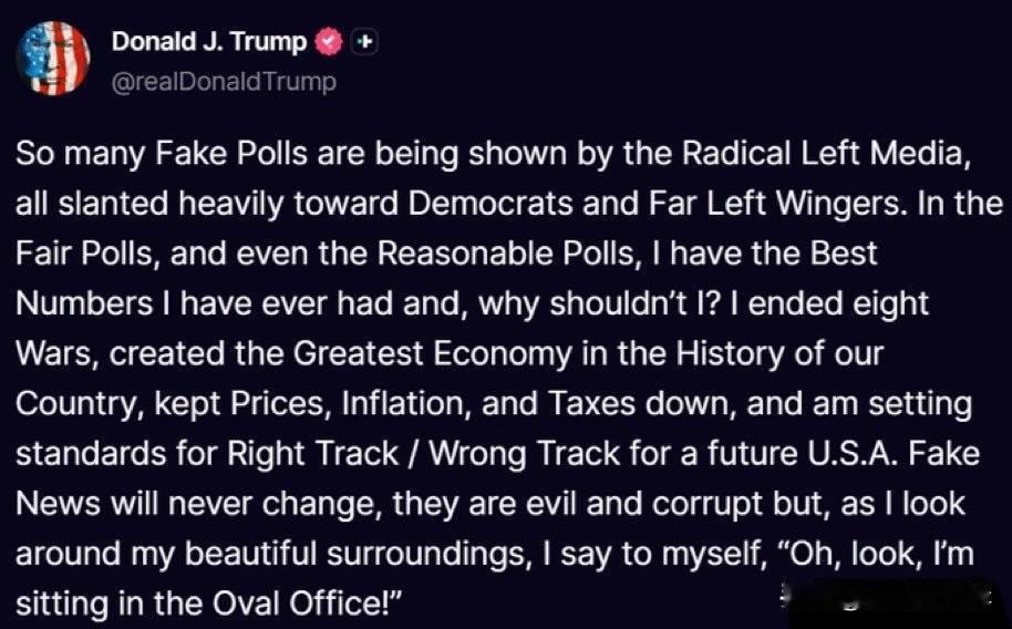 川普:“激进左翼媒体正在展示大量虚假民调,所有这些民调都严重偏向民主党人和极左翼人士。在公正的民调中,甚至是合理的民调中,我拥有我有史以来最好的数据——而我为什么不该有呢?我结束了八场战争,创造了我们国家历史上最伟大的经济,保持了物价、通胀和税率的低位,并为未来的美国设定了正确方向/错误方向的标准。假新闻永远不会改变,他们是邪恶和腐败的,但当我环顾我美丽的周围环境时,我对自己说:‘哦,看,我正坐在椭圆形办公室里!’”