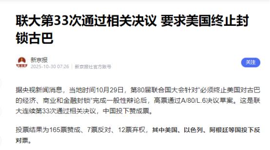 联合国大会重磅宣布!   2025年10月29日,第80届联合国大会以165票赞成、7票反对、12票弃权的压倒性多数,第33次通过要求美国终止对古巴经济封锁的决议。   自1962年美国正式实施对古巴的全面封锁以来,这场没有硝烟的“经济战争”已给古巴民众带来深重苦难,截至2025年,封锁造成的累计经济损失已突破1706亿美元,这个数字,相当于古巴全体民众4.7年的口粮费用。   这笔损失不是冰冷的数字,古巴的发电设备大多是上世纪80年代的老物件,现在能正常运转的连一半都不到。   美国激活了《赫尔姆斯—伯顿法》的条款,直接切断了古巴通过国际金融体系购买能源燃料的渠道。   这导致古巴从土耳其租来的浮动发电船常因缺油停摆,城市里每周都要限时停电,老百姓连冰箱里的食物都没法好好保存。   工业领域更惨,古巴的制糖、烟草是国民经济的支柱产业,可这些工厂经常因为突然断电被迫停产。加拿大一家电力企业本来想在古巴投资,愣是被美国的制裁吓得缩减了项目。   美国通用公司就因为给古巴发电厂提供了涡轮叶扇,被本国财政部罚了270万美元。2024年古巴经济增长率跌到了-1.9%,至今没恢复到疫情前的水平。   最让人揪心的是民生和医疗,超市里的日用品常年短缺,物价涨得离谱。新冠疫情那阵子,美国连疫苗原材料都不让古巴进口。   古巴医生手里连足够的注射器都凑不齐,更别说抢救重症病人需要的呼吸机——美国直接禁止第三国把呼吸机卖给古巴。世界卫生组织早就说过,这种封锁就是在伤害古巴民众的健康,甚至会导致死亡。   这次联大投票的结果特明显,165票赞成,只有7个国家投了反对票。反对的国家里有美国、以色列,连乌克兰都跟着投了反对票,还宣布要关闭驻古巴大使馆、降低外交关系级别。   有意思的是,美国在投票前还干了件不光彩的事。他们给好多拉美、欧洲国家发文件、写威胁信,说古巴的经济问题不是封锁造成的,逼着这些国家改投票立场,还把投票结果和贸易、签证这些利益绑在一起。   美国常驻联合国代表华尔兹在会上还倒打一耙,说古巴和恐怖组织合作、支持委内瑞拉。古巴外长罗德里格斯当场就怼了回去。罗德里格斯说华尔兹在撒谎,还让他看清楚地方,联大既不是美国的聊天群,也不是美国众议院,别在这撒野。这番话直接说出了好多国家的心声。   这已经是联大连续第33次通过类似决议了。从1992年第一次投票到现在,支持古巴的国家越来越多。连美国的盟友欧盟都好几次批评美国的制裁法案,巴西、智利的总统也公开说美国对古巴的做法不公正。美国国内不少民众也反对这种敌视政策,可美国政府压根没当回事。   拜登政府去年刚把古巴移出“支持恐怖主义国家”名单,转头就在今年9月延长了《对敌贸易法》的有效期,继续维持封锁。古巴国家主席迪亚斯-卡内尔说得很实在,古巴是有尊严、有韧性的国家,不会因为美国的施压就屈服。罗德里格斯更直接,说这是真理战胜了帝国主义的谎言。   现在国际社会的态度已经很明确了。美国这种把本国法凌驾于国际法之上的单边封锁,既没道义依据,又遭全世界反对。可只要美国一天不松口,古巴民众就要多受一天苦。这场持续了六十多年的封锁,早该画上句号了。   来源:新京报 【联大第33次通过相关决议 要求美国终止封锁古巴】