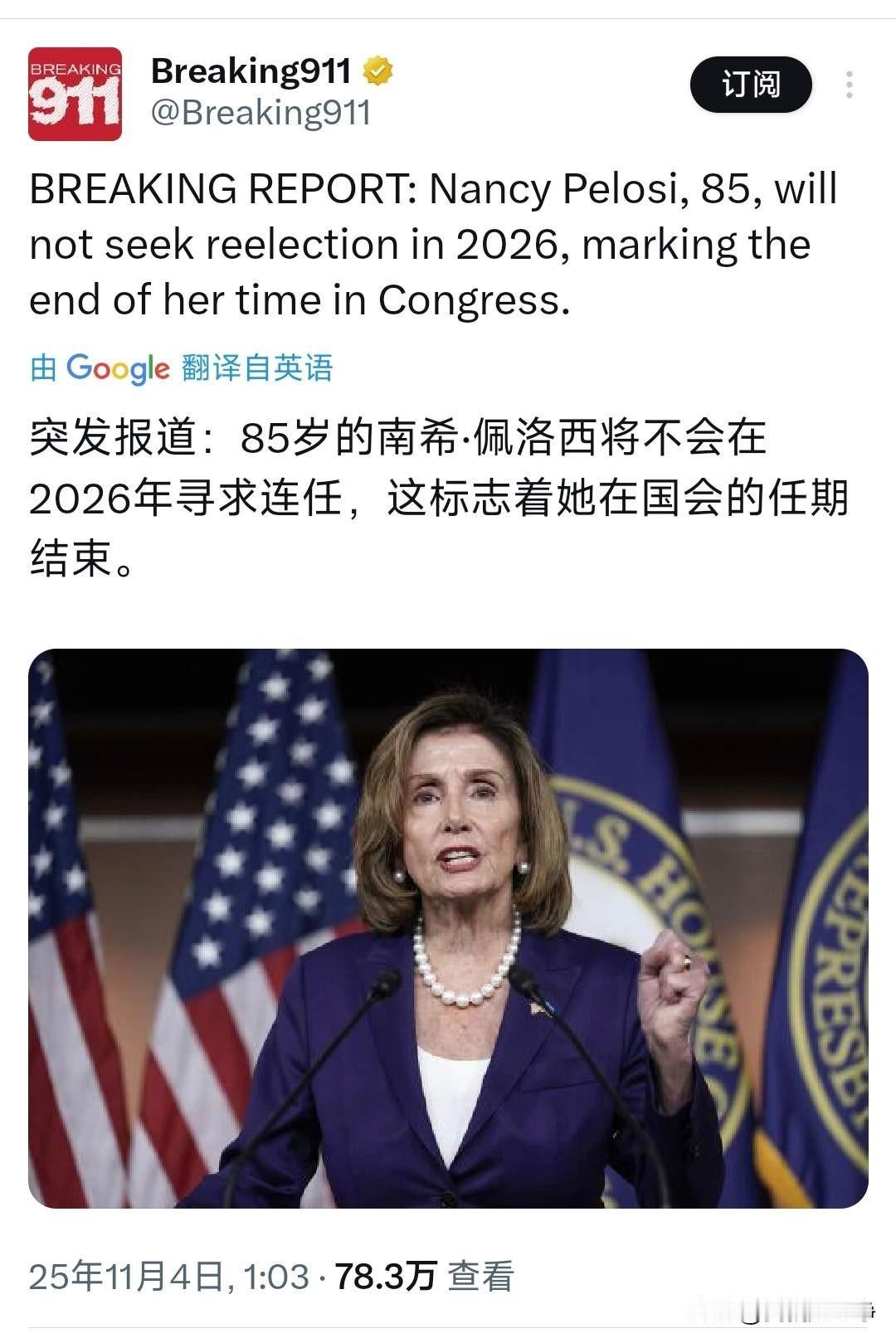 这是一条突发的消息,现年85岁的南希佩洛西将不再谋求连任。 这将意味着佩洛西很快就会退休了。 基本上这就宣告她政治生涯的终结。 她年龄实在是太大了,民主党为什么输,甚至包括整个美国现在问题为什么这么严重? 就是跟这些高龄的政客霸占资源有关。 天天在国会山里面当股神。 所有的权利和资源都被他们瓜分了。 青年才俊根本得不到任何的晋升。 不崩盘才怪呢。 民主党的人才储备,现在明显是青黄不接。 如果特朗普能够把纽森干掉。 那么民主党就彻底没戏了。