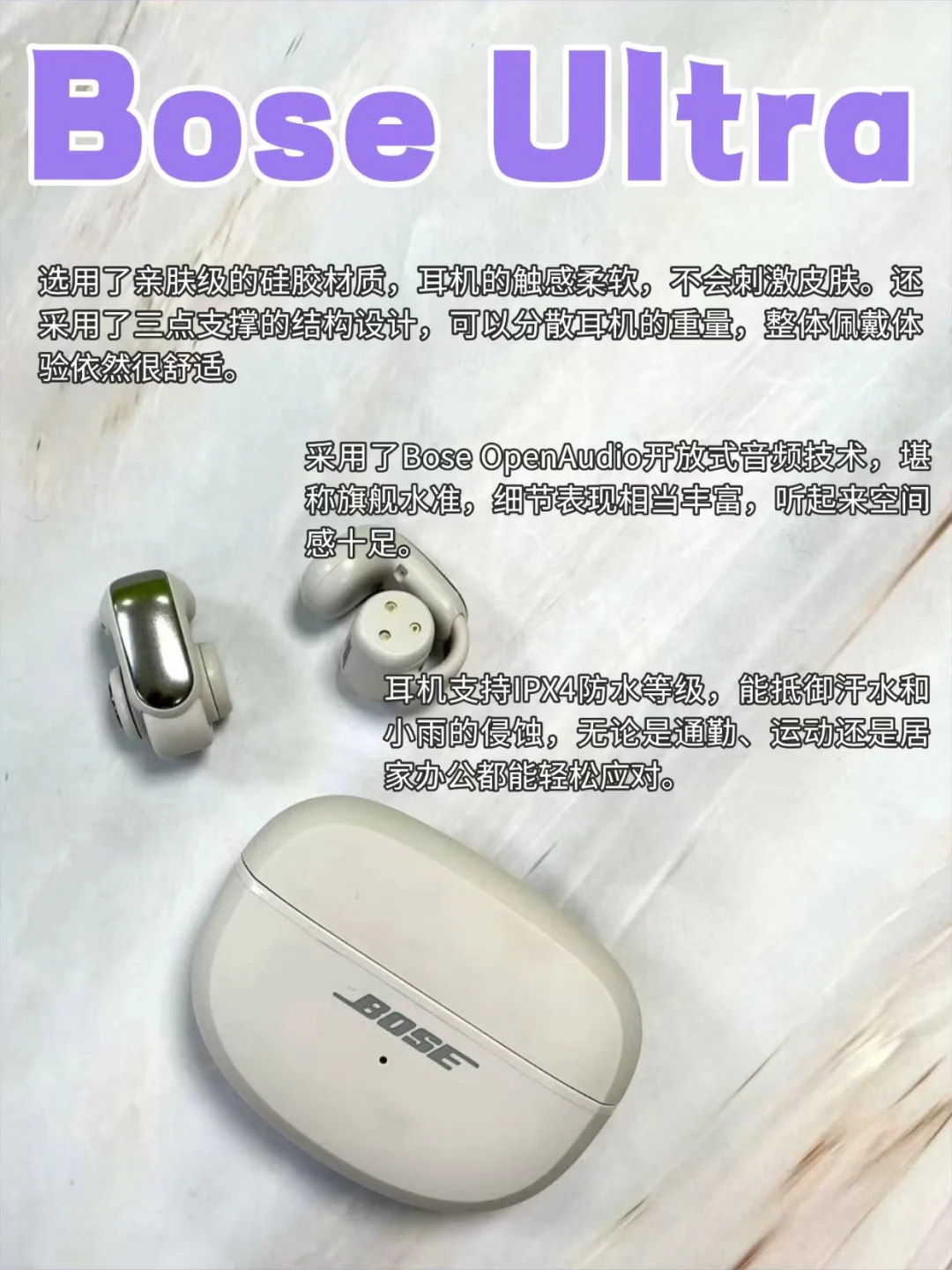 单耳的重量为6.35g,不过耳机采用了三大支撑的设计,可以有效分散耳机的重量,佩戴依旧舒适。耳机搭载了Bose OpenAudio开放音频技术,耳机的声音饱满有力,三频的表现均衡。耳机具有IPX4的防水等级,可以有效防止汗水或者雨水对耳机造成的损坏。