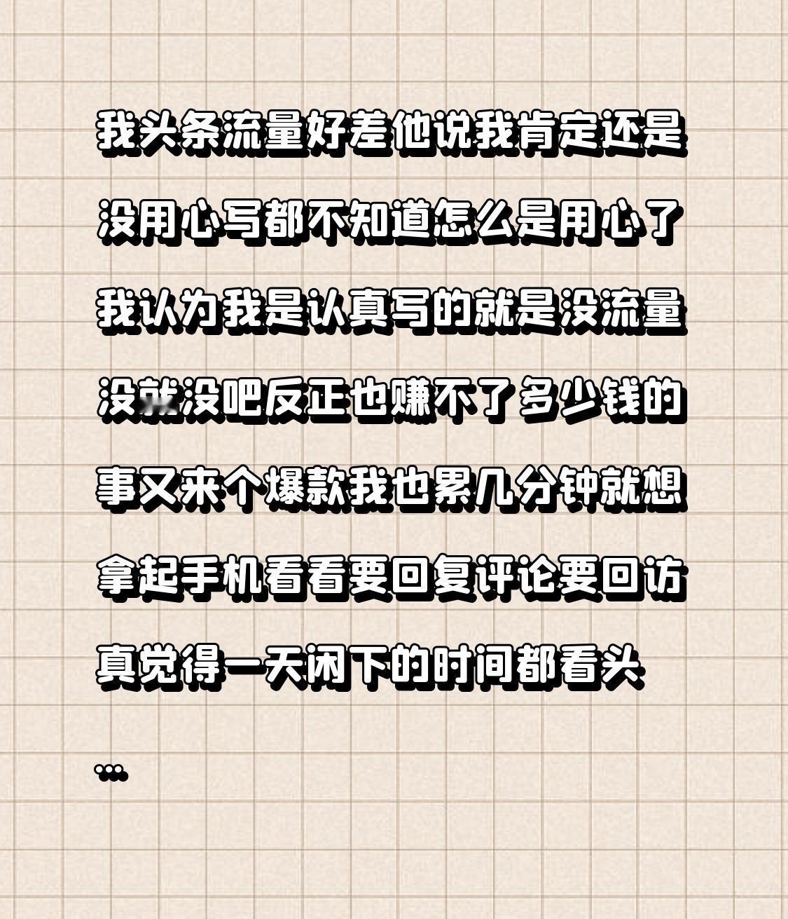 我头条的流量实在是糟糕透顶了 他说我肯定还是没用心去创作 可我压根儿就不知道怎样才算用心了 我自认为写得极为认真 可就是没流量 没就没吧 反正也赚不了几个子儿 就算再来个爆款,我也觉得身心俱疲 每隔几分钟就忍不住拿起手机瞧瞧 既要回复评论,又得回访 真感觉一天里闲下来的时间全耗在头条上了