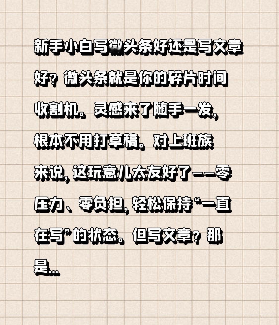 新手小白 写微头条好, 还是写文章好? 微头条可谓是高效利用碎片时间的利器。灵感乍现时,随手就能发布,根本不用打草稿。 对上班族来说,它十分友好——毫无压力、没有负担,能轻松保持“持续写作”的状态。 但写文章就不一样了,那可是考验真本事。得平心静气地梳理逻辑,一句话或许都要反复琢磨半小时。 常常写到一半就思路受阻,只能先存为草稿,等第二天再接着写。发出去后阅读量还少得可怜,分分钟让你认清现实。 你最幸福的是什么事 能过一辈子的夫妻,都是因为爱情吗 怎样让自己越活越有价值 存钱需要对身边的人隐瞒吗? 如何克服自己内心的焦虑? 一般老人干农活,干到什么岁数? 人到了老年后,拥有什么最珍贵? 钱真的是越来越难挣了吗 怎样让自己不再渴望被爱 饺子你是喜欢吃蒸的还是煮的? 有多少夫妻吵着吵着感情就变淡了? 怎样的行动,才能解除焦虑? 发一张你手机里的风景照 为什么现在的钱都越来越难挣了 女孩子长大后哪里是自己真正的家?