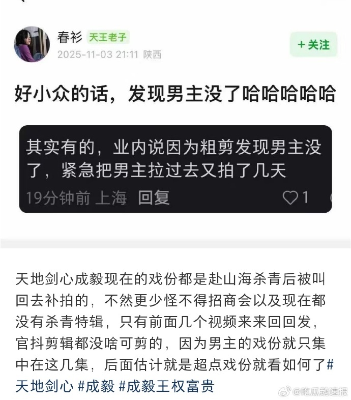 网传《天地剑心》目前呈现的成毅戏份,均为他《赴山海》杀青后返回剧组补拍所得。这种主力演员跨剧补拍的安排稀缺,能看出对作品细节的把控。成毅赴山海杀青补拍天地剑心网传成毅天地剑心现在戏份是后期补拍