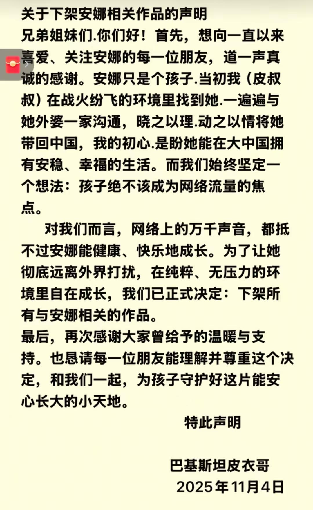现在全网最后悔的男就是皮衣哥了吧! 不是因为带安娜回到中国,也不是因为有网友认为他是为流量才做这些的,而是因为给超群伤透了心,真后悔帮他了 刷到皮衣哥下架所有安娜视频的声明,我直接绷不住了!前几天还因为和李超群交恶吵得稀里哗啦,账号数据嘎嘎暴涨,这才几天就突然“保护未成年人”了?说实话,我真的有点看不懂,这波操作到底是真情流露还是剧本杀啊?难道网红圈的套路都这么丝滑了吗? 本来我还觉得皮衣哥挺给力,带安娜回国多正能量,结果一看数据,我晕!交恶三天播放量破1200万,涨粉10万+,互动率飙了47%,这流量涨得比坐火箭还快!我想起之前追过一对网红情侣,天天演撕 逼分手,结果后来发现是剧本,涨粉百万后又复合了,当时我郁闷得想骂街,现在看皮衣哥这操作,简直如出一辙啊! 说真的,网红圈这套路我算是看透了!争议性内容就是流量密码,就像我奶常说的“种什么因得什么果”,你敢撕 逼,平台就敢推流。之前哈哈姐妹撕 逼后掉粉5万,直播人数反而涨40%,商业报价还涨了,这说明啥?越有争议越有饭吃!皮衣哥和李超群这波“交恶”,刚好踩中平台算法的G点,网友吵得越凶,流量越往上涨,这闭环玩得绝绝子! 本来想为皮衣哥的“保护行为”点赞,结果回头一想,不对劲啊!之前他账号里全是安娜的视频,条条都是爆款,流量密码拿捏得死死的!交恶事件流量涨到顶峰,他突然说要保护孩子下架视频,这时间点也太寸了吧?不是吧?真的是为了保护孩子?那之前为啥天天发? 我想起去年刷到的“云南波波”伪公益事件,博主给老人发3000块,拍完视频又收回2800,还教孩子说谎,当时我气得鬼火绿!现在看皮衣哥这事儿,真的怕安娜最后也只是被利用的“流量道具”。说实话,他声明里说“和外婆反复商量才带回安娜”,可之前为啥不考虑过度曝光的问题?非要等流量收割完才想起保护,这操作也太膈应人了!吗喽的命也是命,安娜的童年就该被这样消费吗? 姐妹们,咱以后看网红热点真的别太上头!流量时代,真真假假太难分辨了,就像我之前给一个“助农”网红下单,结果收到的水果全是烂的,后来才知道是摆拍,当时我崩溃得想卸载软件!现在想想,那些所谓的“正能量”“公益”,可能只是网红变现的工具。 我奶总说“凡事别只看表面”,网红圈的剧本比电视剧还精彩,今天撕 逼明天和解,流量收割完就立人设,咱看看热闹就行,别被带着节奏跑,更别随便花钱打赏或下单。 总之,保护好自己的钱包和情绪才是YYDS!记住,网红的话听听就好,别太当真,不然受伤的还是自己!你说是吧!