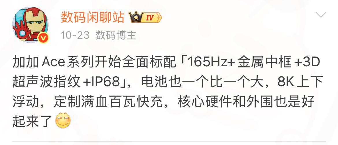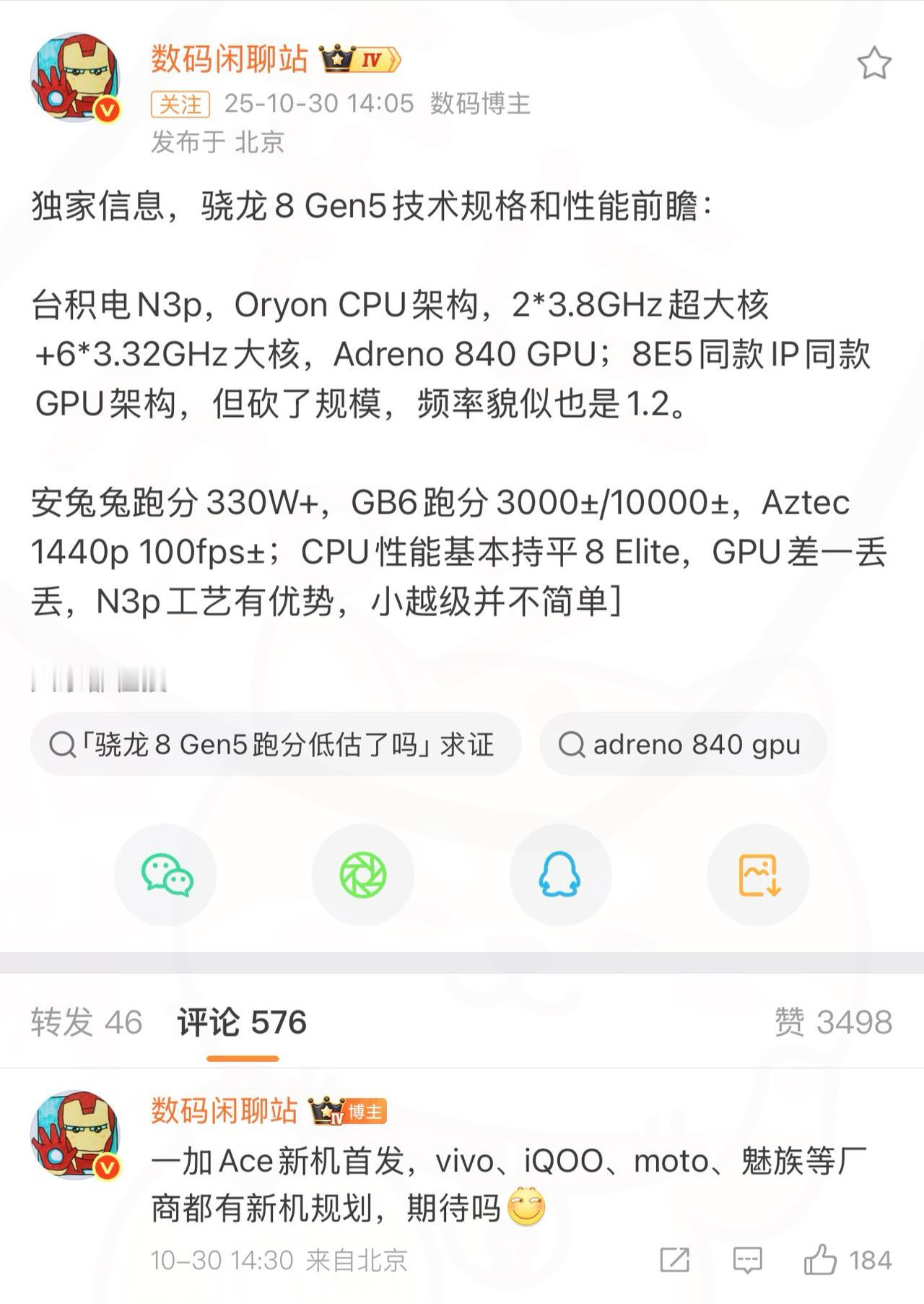 本以为一加15和Ace6就够友商喝三壶 没想到还有一加Ace6 ProMax,新的芯片和架构,还没发布就已经被曝光了 已经确定了,一加还有新机,首发骁龙8Gen5,跟8E5属于同3nm工艺,但CPU为新架构Oryon,GPU跟骁龙8Elite Gen5同款IP但砍了一丢丢,跑分330万+,站哥说是骁龙8Elite的小越级[吃瓜群众] 另外还有一些信息:屏幕也是1.5K 165Hz的超高刷屏,估计就是尺寸更大些,完了Ace6有的它都有。但是配备了8000mAh±的超大电池+满血100W/120W快充。 感觉网友机场碰见的就是真机没错了,一加Ace6 ProMax,换了新芯片,然后散热再堆猛些,加上新工艺的优秀能效,我不敢想象续航能有多猛[捂脸]
