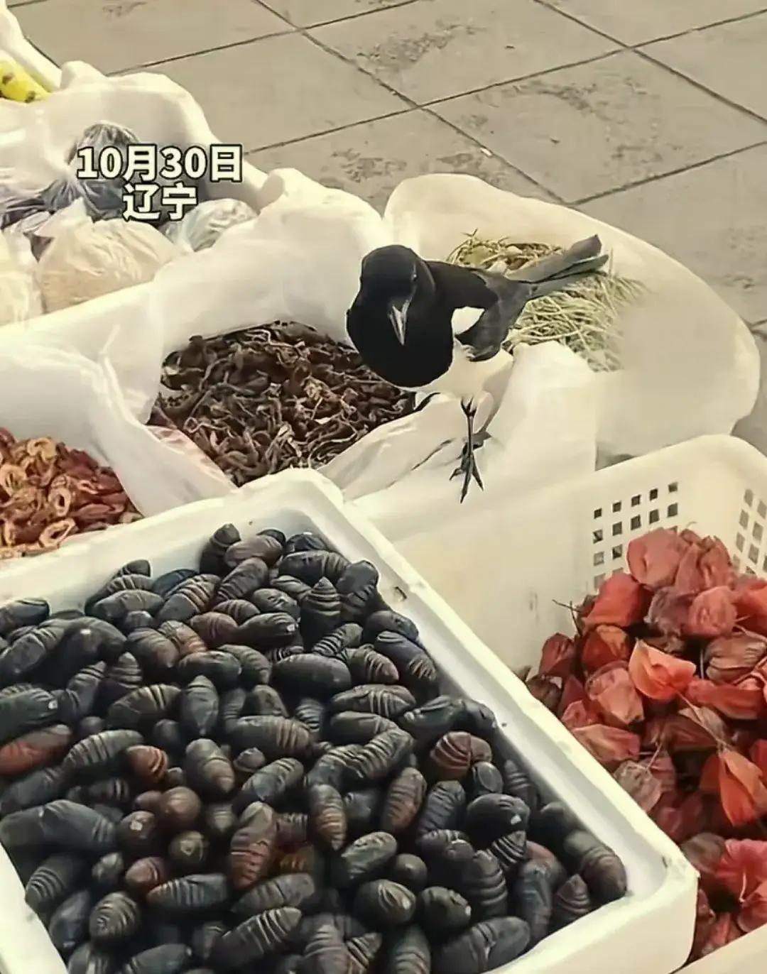 “人善被喜鹊欺”?辽宁沈阳一大姨摆摊卖菜,摊位每天都会来一只喜鹊吃东西,还专门挑