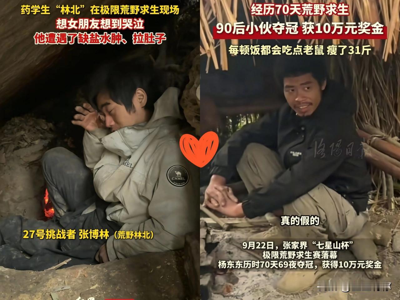 于知道了 为什么荒野求生决赛每人再加2万 每个人都不开心了,就连乐观的林北都抹眼泪! 赛事本就没时限,谁撑最久谁赢,之前就有选手靠抓老鼠、编渔篓硬扛70天 。现在多2万诱惑,已经熬了27天的人,哪舍得轻易放弃?可继续熬可能要到37天、47天,甚至过年,身体和心理都是煎熬。 这让我想起国外那比赛,有人打麝牛又猎黑熊,吃喝不愁像度假,另一个全靠硬挺,最后被节目组劝退。现在这2万,就是逼着选手选:是靠毅力硬扛,还是认怂早退? 奖金加码看似鼓励,实则把“坚持”变成了赌局。你们觉得这钱该加吗?换作是你会咬牙撑下去吗?荒野求生比赛