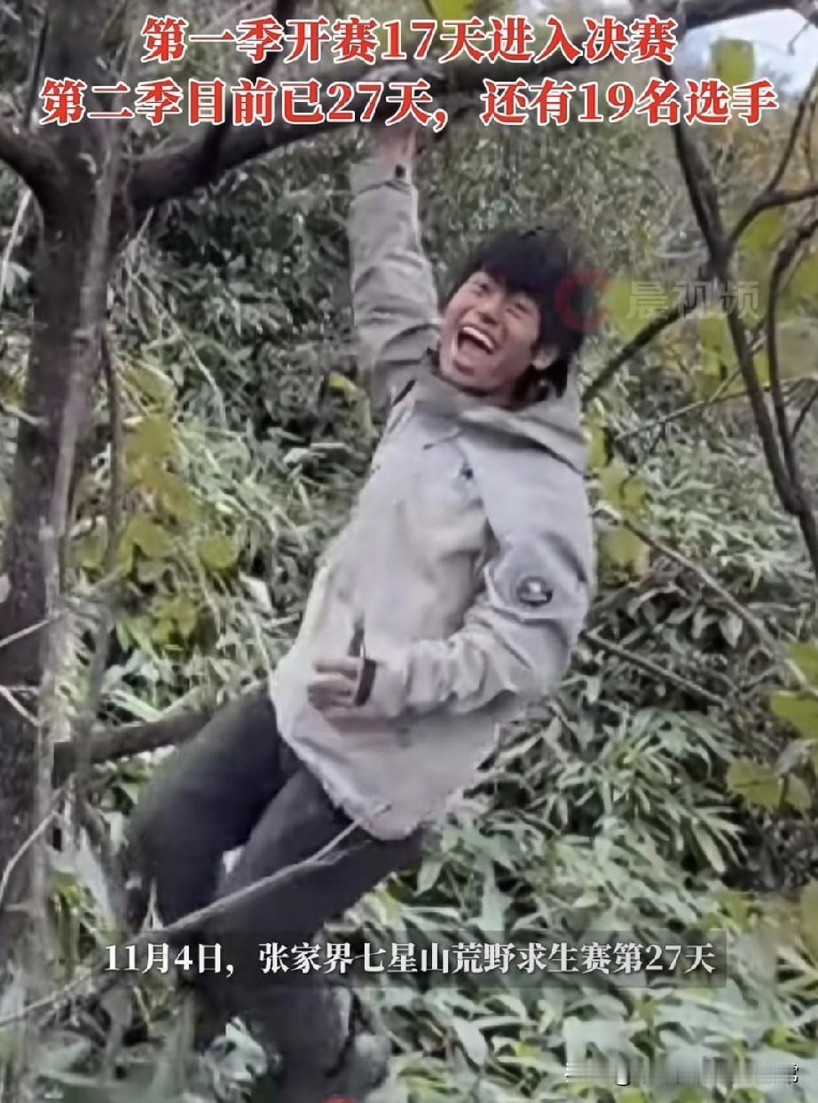 荒野求生林北,为2万奖金,小伙连女友都不要了 张家界七星山荒野求生赛,林北一听奖金加码到2万,直接在树上蹦跶得像只“返祖猴”,女朋友生日都抛脑后了!这季比赛狠到半决赛要搞到过年,19个选手在深山里啃树皮、斗严寒,为了奖金连团圆年都不要了。 有人说这是“拿命换钱”的疯狂,也有人觉得“荒野挑战就得这么野”。咱打工人平时加班都喊累,要是给你2万,让你在山里熬到过年,你敢不敢冲?
