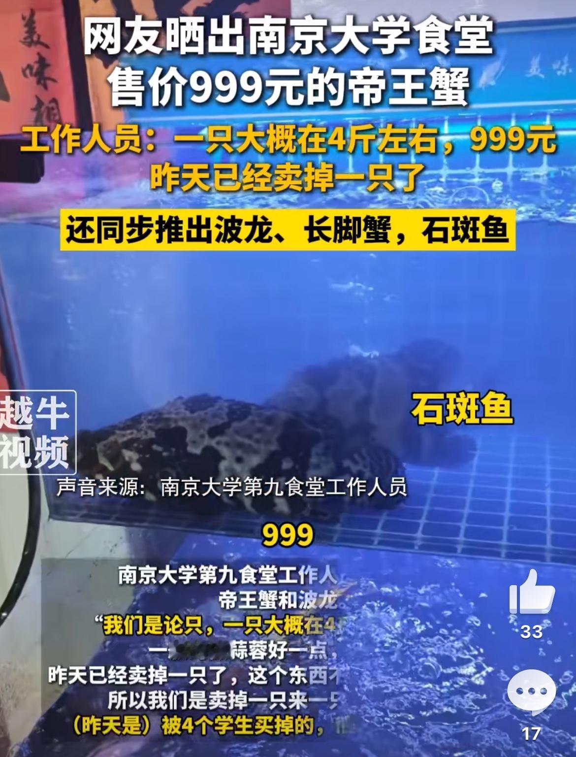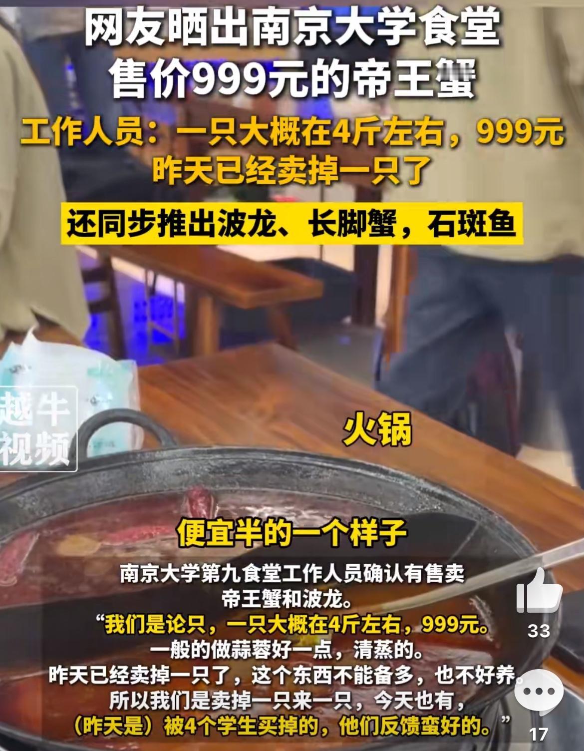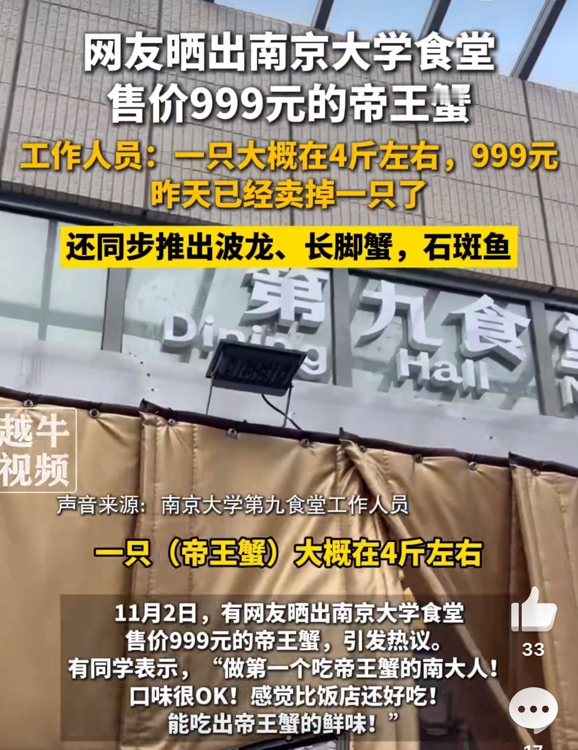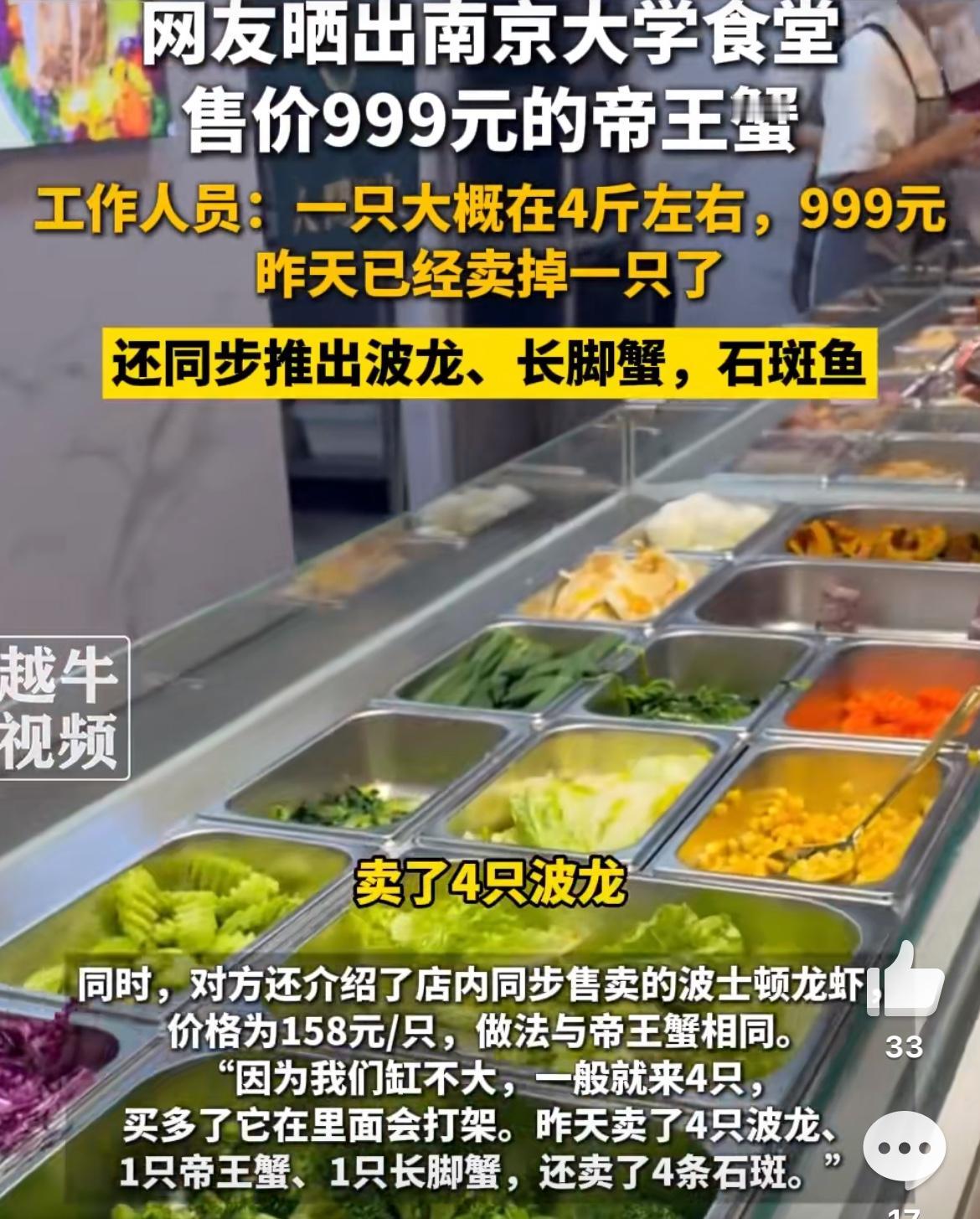 南京大学食堂999的帝王蟹让某些人破防,没上过大学的人大惊小怪,大学也是有高档宴会厅的。越是厉害的大学,各种企业老板、富豪多的很,他们在学校是有餐饮需求的,就是很多教授也是非常有米的,他们消费得起。至于学生,虽然生活费是靠家长,其实也有相当一部分学生有这个实力消费。浦口大学生食堂 南京中餐自助餐