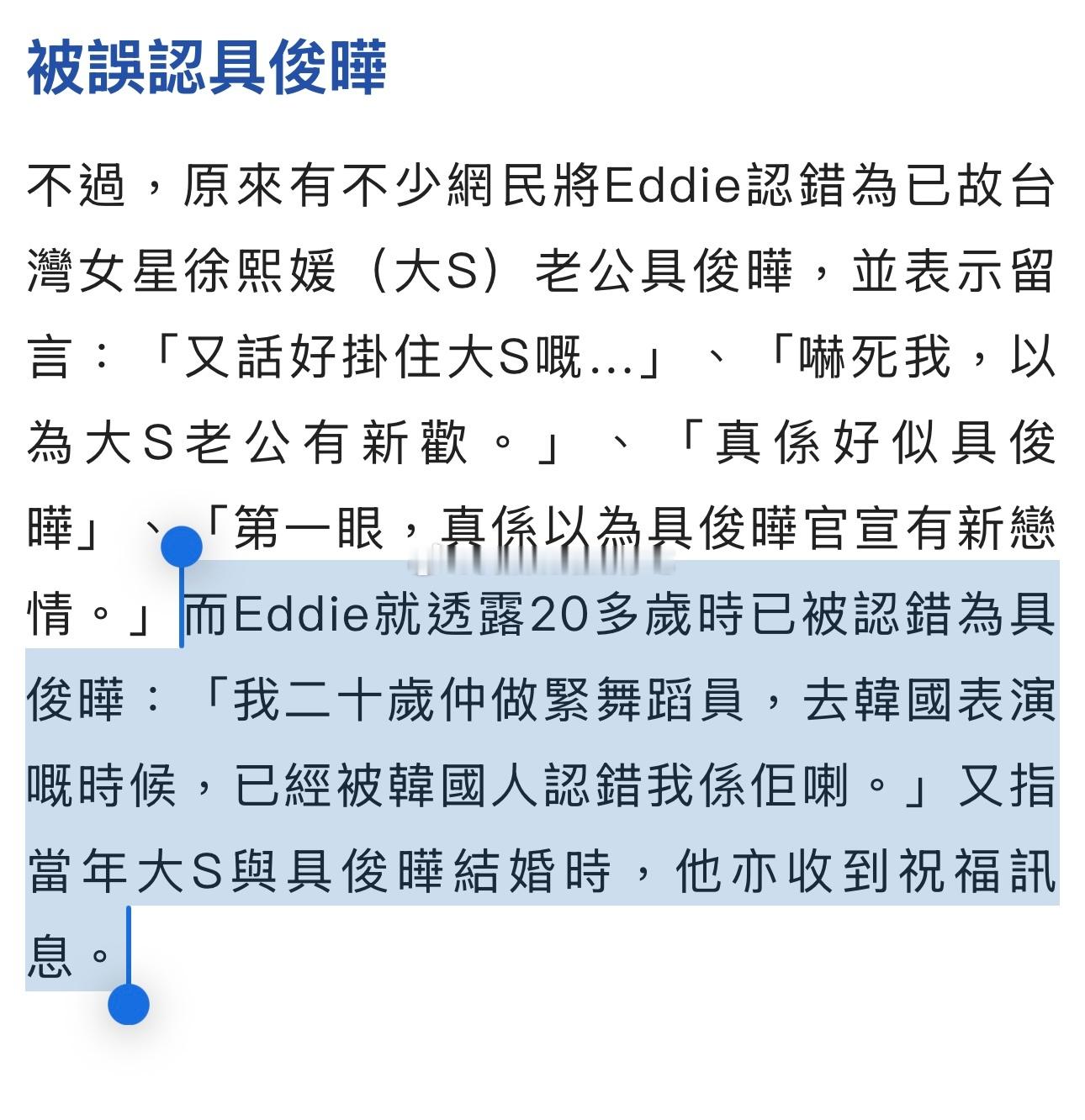彭怀安(Eddie)透露20多岁时已被认错为具俊晔:「我二十岁还在做舞蹈员,去韩国表演的时候,已经被韩国人认错我是他。」又指当年大S与具俊晔结婚时,他亦收到祝福讯息。 ​​​