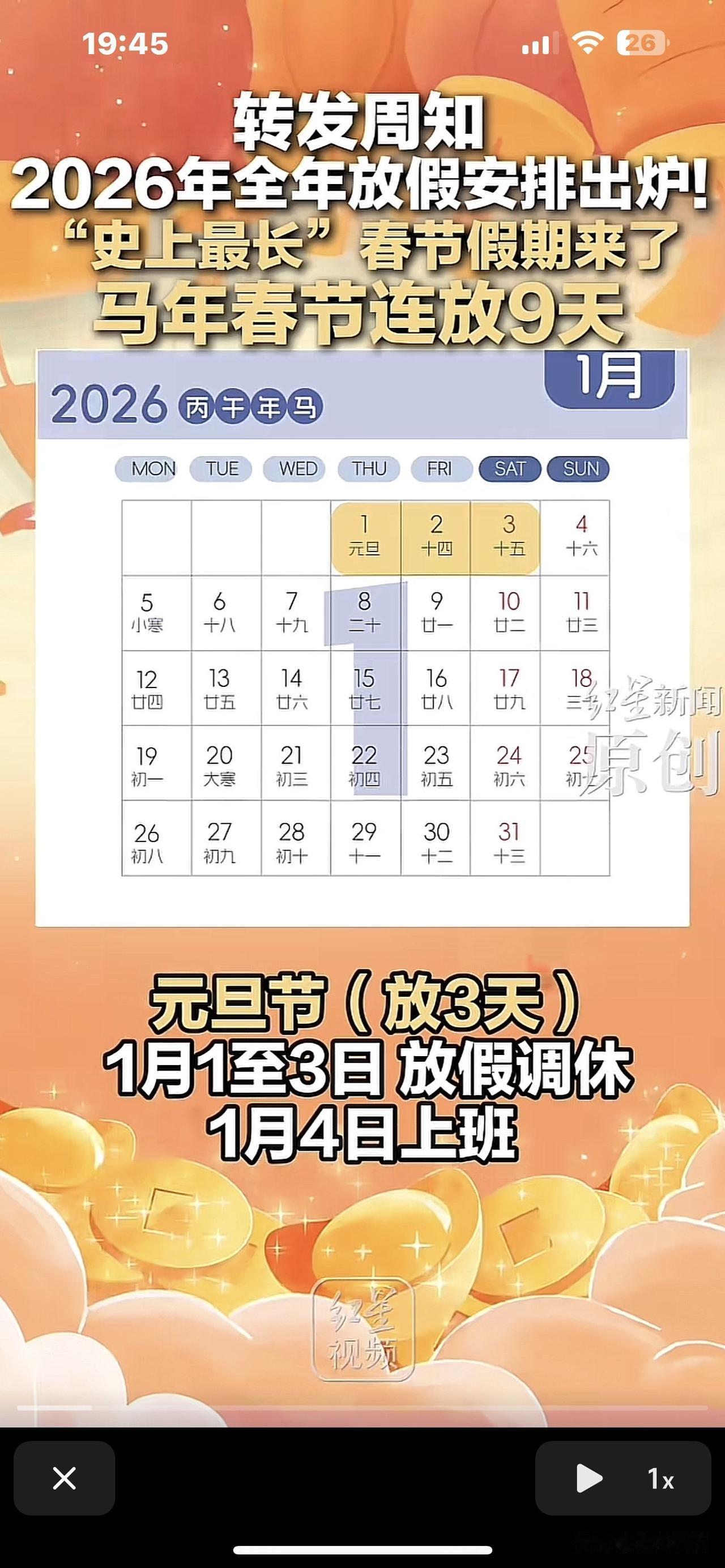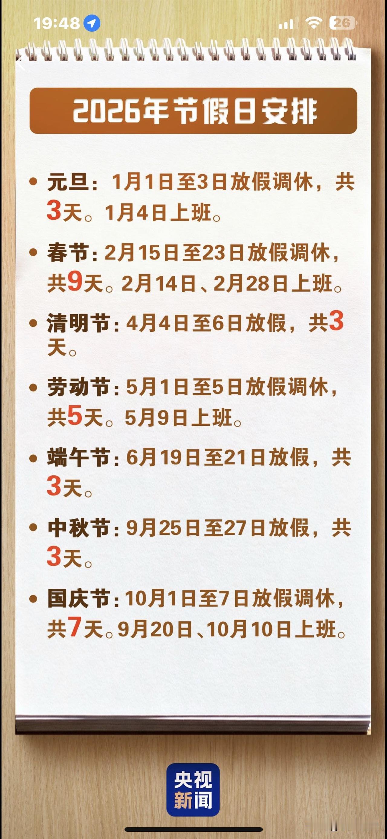 重磅消息!重磅消息! 史上最长春节假期来袭。 11月4日,2026年法定节假日安排公布。2026年春节法定假期敲定,从2月15日休至2月23日,共计休息9天。 除此之外,2026年元旦同样连休3天,1月4日上班。 另外,清明节、端午节、中秋节均放假3天。劳动节调休5天,国庆节调休7天。 春节能多休息2天,对不少在外打工人而言确实是个好消息,也便于我们合理规划出行。 (图片来源网络)