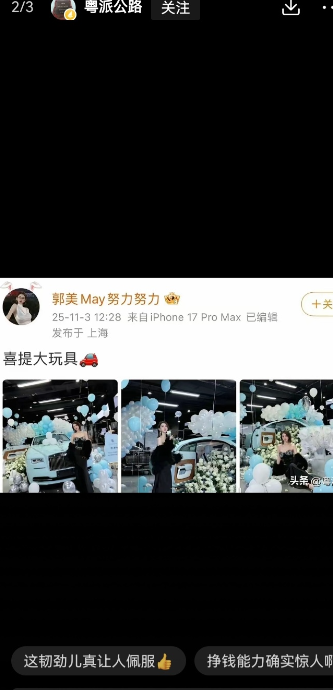 郭美美这“大玩具”一晒,我刷到的时候都愣了下——这姐们儿是真不怵事儿啊。评论区里有人酸“牢里蹲几年出来更富了”,也有人小声叨叨“这钱到底哪儿来的”,其实谁心里都门儿清,她吃准了“争议”就是流量,晒豪车跟早年晒玛莎拉蒂一个路数,就是要让人盯着她聊。
