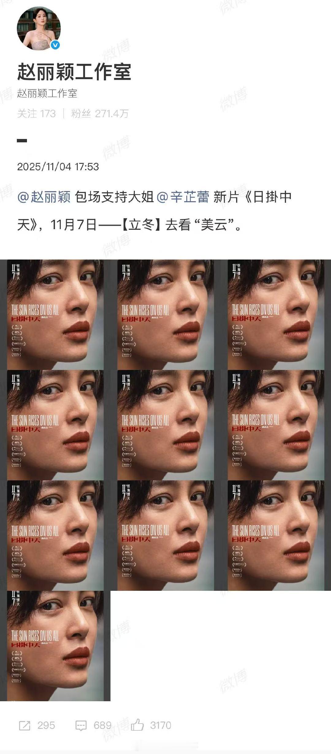 【赵丽颖包场支持辛芷蕾新片】赵丽颖包场辛芷蕾电影日掛中天11月4日,发文:包场支持大姐新片《日掛中天》,11月7日——【立冬】去看“美云”。