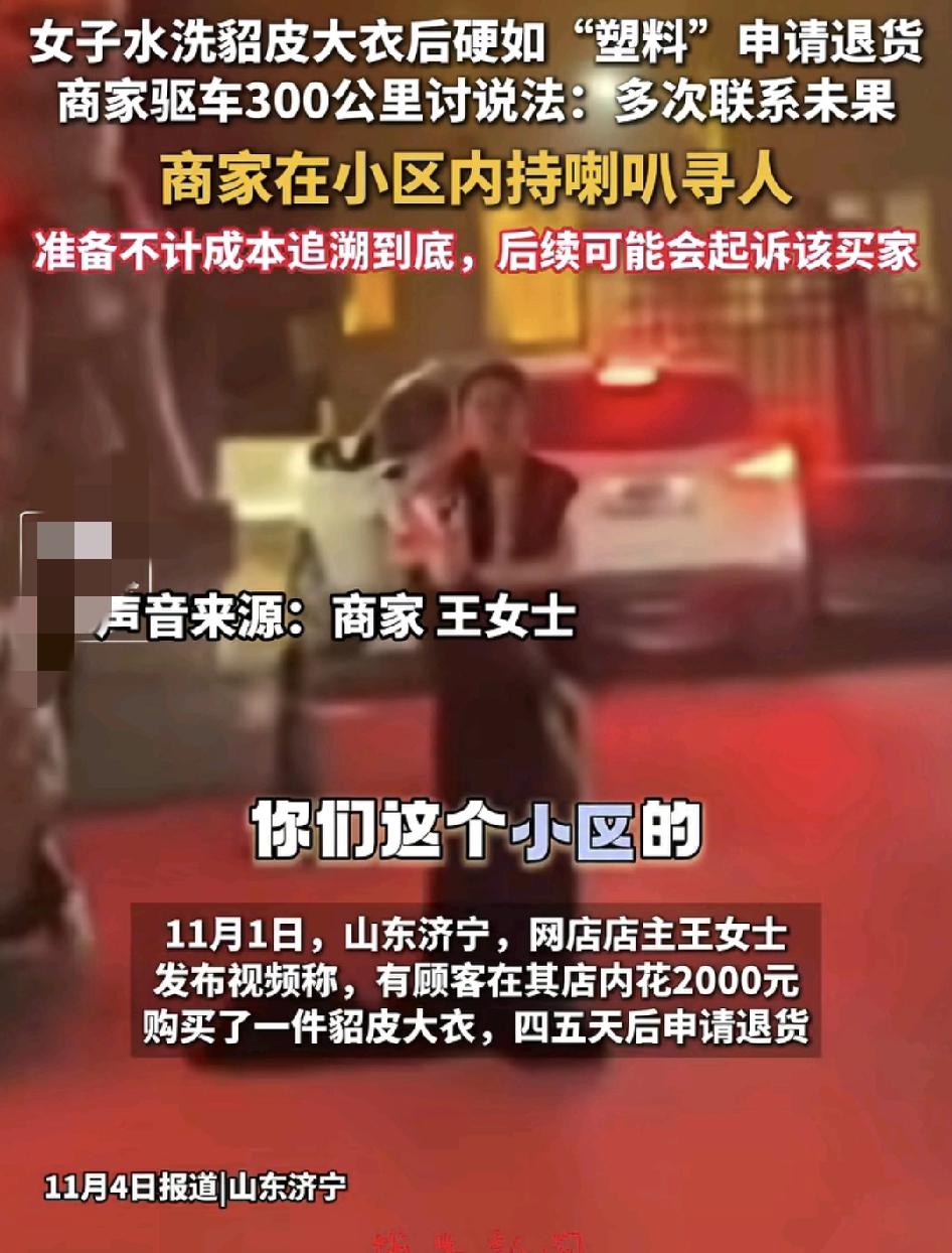 山东济宁一女子在往上购买了一件貂皮大衣,却水洗之后退货,商家为了追讨说法,多次联系买家都没有回应,商家一气之下驱车300公里来到了。女子所住的小区用喇叭报出其手机号。因为买家的收件没有写明什么门牌号,所以买家就在楼下一直用喇叭来回说明情况,后续还计划起诉买家。不少人说貂皮大衣价格这么贵,商家也不远千里。追溯到底,证明货一定是真货,但这买家素质就真的太差了。