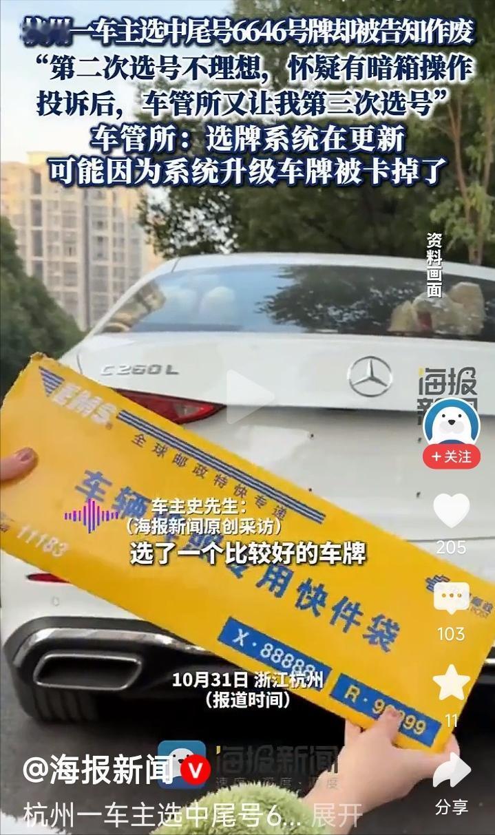 浙江一男子摇车牌号,幸运摇中了“6646”,他还没来得及确认,下一秒就被告知作废,让他重选一次,说是系统升级,导致把号码卡掉了,男子非常郁闷,只能再次选号,他怀疑有暗箱操作,进行投诉后,车管所又让他第三次选号!网友不解:这号码好在哪? “6646”号牌作废:当个人幸运撞上系统瑕疵,信任该如何安放? 在浙江,一个看起来挺普通的四位数车牌“6646”,居然搅动了一场关于规则、信任与公平的巨大风波。这事的要害,其实不在于这个号码到底值多少钱,而在于当一个普通人按规矩得来的“小确幸”,被系统一句轻飘飘的“技术故障”给没收时,我们对规则本身的信心,还能剩下多少? 这起发生在杭州的风波,本质上是一场关于价值的错位和博弈。“6646”这个号码,对那位摇中的男车主来说,意义可太大了。他觉得这号码顺眼,怎么看怎么舒服,特别是那“三个6”,在他眼里就是“顺利”的化身,是上天给的缘分。 激动之下,他赶紧掏出手机,“咔嚓”一声拍下来留作纪念。可对一些旁观的网友来说,这串数字就没那么玄乎了。有人觉得这号也就一般般,根本算不上什么极品靓号,甚至有人拿地域说事,表示这号码搁广东可能都没人多看一眼。 还有评论一针见血地指出,除非是“6666”这种王炸级别的号码,否则谈什么“暗箱操作”,实在有点小题大做了。正是这种“不上不下”的定位,让整件事变得扑朔迷离。你说它好吧,好像没那么稀有;你说它不好吧,当事人又确实视若珍宝。 紧接着,戏剧性的一幕上演了。车主的喜悦还没持续多久,系统就无情地宣告:这个号码作废了。官方给出的解释是“系统升级”导致的问题,换个更技术的说法,就是号码在系统中被“卡掉”了,没记录上。 处理方式也简单粗暴:你得重新选一次。车主当然不甘心,他尝试沟通,问能不能把那个“6646”给找回来。得到的答复是冰冷的:记录没了,恢复不了。 这种说法显然无法让车主信服。特别是当他第二次摇号的结果远不如人意时,那种从云端跌落的感觉,让他心里瞬间冒出了一个巨大的问号:这背后是不是有猫腻?他开始怀疑,是不是车管所看这号还不错,就故意找个借口收回去,将来好拿去拍卖? 这种猜测,迅速在网上找到了共鸣。很多人觉得,就算真的是系统故障,那责任也该是车管所来扛,凭什么让车主来承担损失?官方虽然在接到投诉后,又给了车主第三次选号的机会,并反复强调是系统维护造成的意外,绝非人为,但这套说辞在已经破裂的信任面前,显得苍白无力。 当一个公共机构的技术解释,败给了更具戏剧性的“阴谋论”时,问题的根源往往就不在技术本身了。大家追问的是更深层次的程序正义问题。比如说,系统要升级维护,为什么不提前广而告之? 更核心的拷问是,为什么系统设计得如此脆弱?一个用户选定的号码,理应有即时锁定的机制来保护,怎么会因为后续故障就轻易失效?这种程序上的漏洞,才是让公众感到愤怒和不安的关键。 说到底,人们怕的不是摇不到一个好号码,而是怕规则本身就是一个可以随意涂抹的玩笑。摇号,承载的是一种“运气面前,人人平等”的朴素期待。当这个承诺被打破,伤害的是整个社会的信任基础。就像有人引用的那句老话,“不患寡而患不均”,公平感的缺失,远比物质的得失更让人难以接受。 所以,“6646”风波的真正症结,已经超出了一个号码的归属。它像一面镜子,照出了公共服务在技术严谨性和危机沟通上的短板。要想真正平息争议,光给车主补偿远远不够,更重要的是用透明公开的流程和更完善的技术保障,去修复那个看不见但至关重要的东西——公信力。毕竟,摇号摇出的是数字,但守住的,应该是人们对公平和正义的信心。这份信心,可经不起一次又一次的“系统作废”。