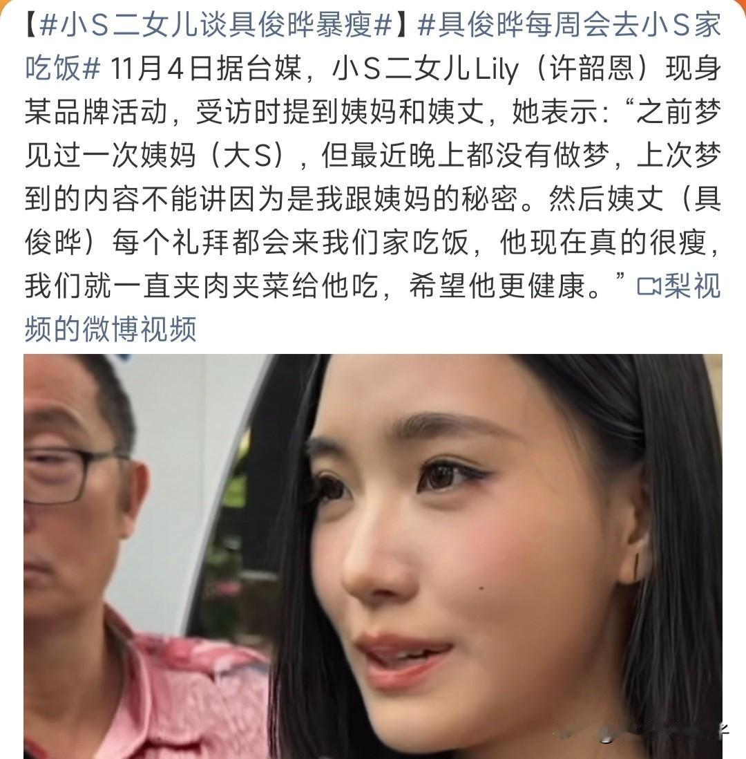 具俊晔经常去小S家聚餐,看来已经慢慢从悲痛中走出来了! 11月4日,据媒体报道,小S二女儿Lily透露具俊晔经常来家里吃饭,大家也会暖心的给欧巴夹肉,咱就说,想想画面都挺温馨。 大S去世以后,具俊晔坚持到爱妻的墓地前守护,由于伤心难过,甚至拒绝参加S家聚餐,心情可想而知。 上一次,具俊晔露面,还是出席小S的庆功宴,帮S揉肩缓解疲劳。 这样看来,具俊晔已经慢慢从伤痛中走出来了,果然,时间可以冲淡一切。 另外,直到现在,S家仍然对具俊晔一如既往的关心,可见,真诚永远是必杀技,相处久了,看的就是人品。 说句题外话,Lily真的颜值出众,跟大S有几分神似,很有明星气质,女儿如此优秀,小S才是人生赢家。