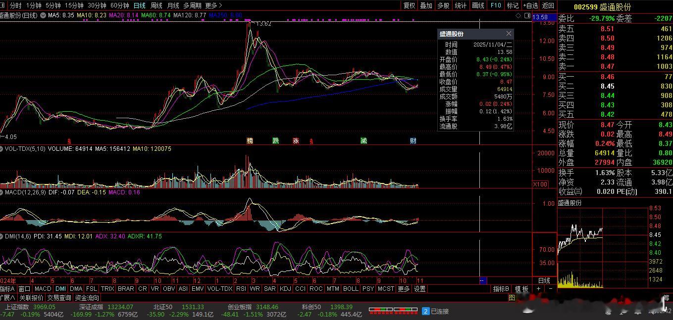 视野盘面:前期双头:八底脉冲。2025-11-04 截至11:30:股价报收:8.47元。该股上涨:0.24%。成交总量:64914手,成交金额:5480万元。总换手率1.63%,观总市值:45.12亿元。流通市值:33.71亿元。