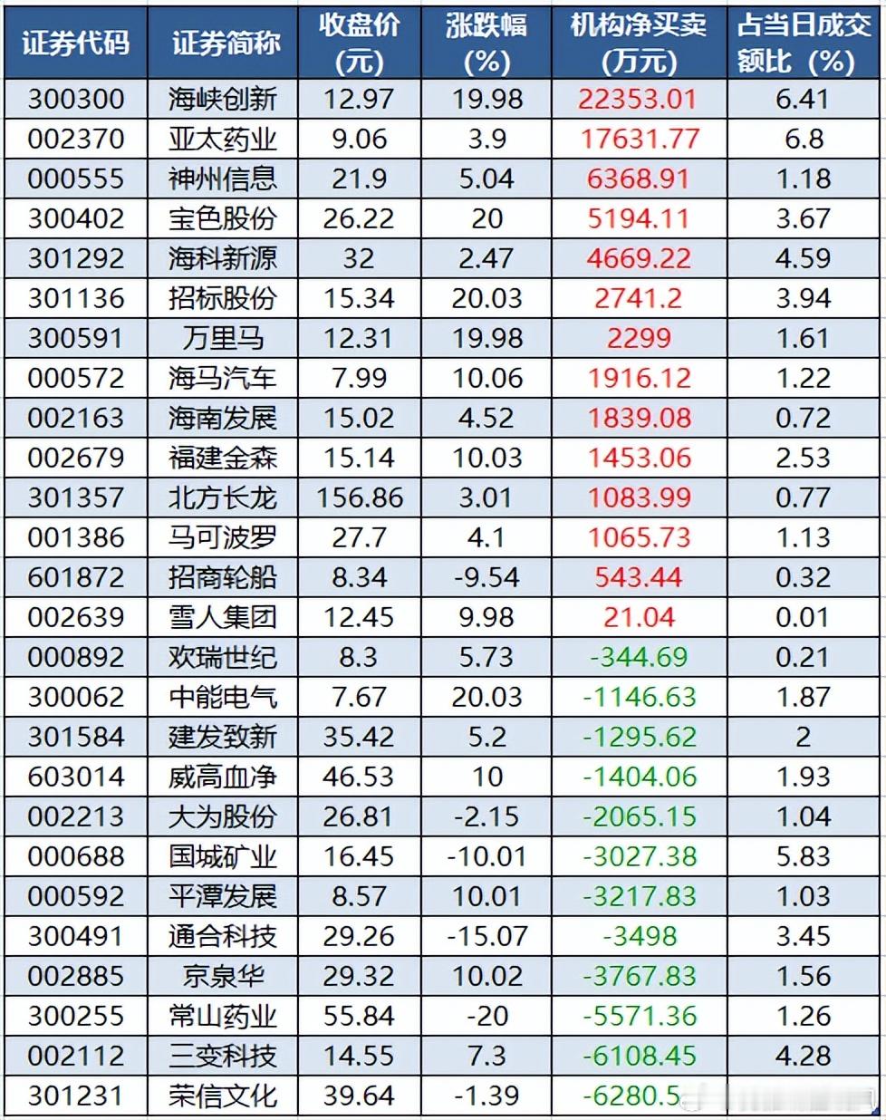 收盘龙虎榜数据:机构席位资金合计:净买入约3.15亿元。其中,净买入的个股14只,净卖出的个股12只。机构净买入最多:海峡创新,净买入金额约2.24亿元;机构净买入居前:亚太药业、神州信息、宝色股份等股。机构净卖出最多:荣信文化,净卖出金额约6280.53万元;机构净卖出居前:三变科技、常山药业、京泉华等股。