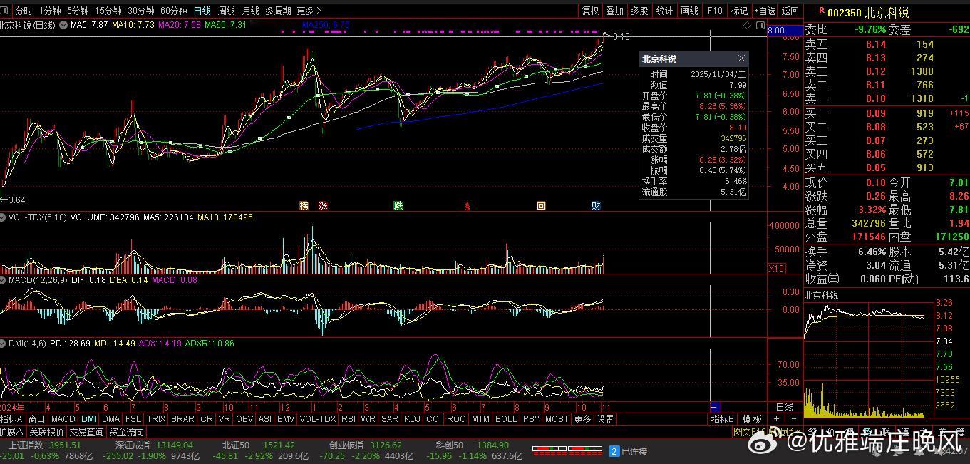 视野盘面:前期双顶:超越双顶:2025-11-04 截至1500:股价报收:8.11元。股指上涨:3.44%。成交总量:344391,成交金额:2.80亿元。总换手率6.49%,观总市值:43.93亿元。流通市值:43.03亿元。