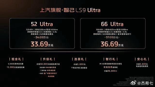 此次预售车型包含52 Ultra与66 Ultra两个版本,核心参数差异化明确:52 Ultra搭载52kWh电池,CLTC纯电续航320km、满油满电综合续航1454km;66 Ultra配备66kWh电池,纯电续航提升至402km、综合续航达1508km,两车均标配“恒星”超级增程技术与灵蜥数字底盘3.0,支持双向24°四轮转向,双电机矢量四驱系统可实现4.9秒百公里加速。