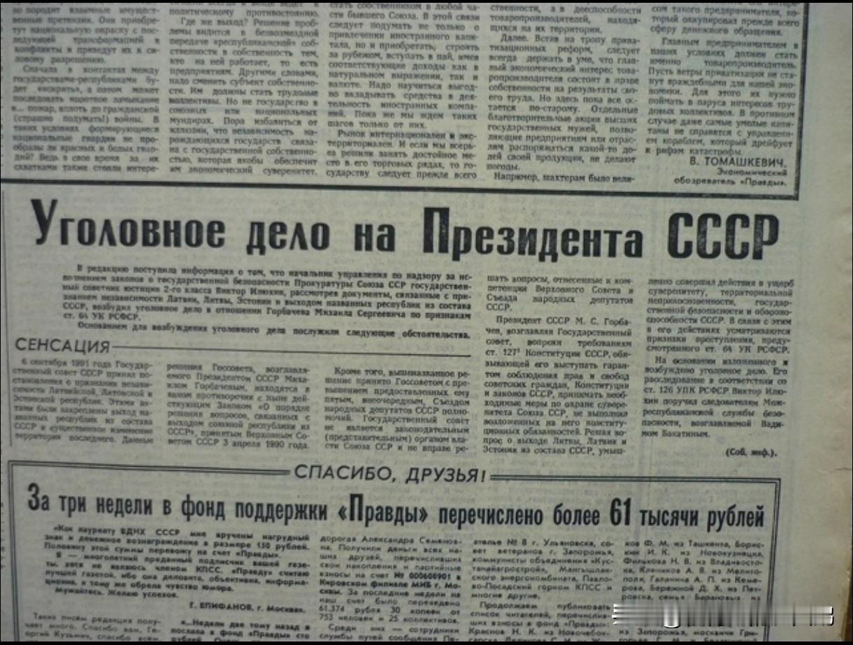 🔴 1991年11月4日,苏联检察院国家安全领域执法监督管理局局长、二级国家司法顾问维克托·伊万诺维奇·伊柳欣,在审查拉脱维亚、立陶宛和爱沙尼亚三国脱离苏联的相关材料后,依据《俄罗斯苏维埃联邦社会主义共和国刑法典》第64条(叛国罪),对时任苏联总统米哈伊尔·谢尔盖耶维奇·戈尔巴乔夫提起刑事诉讼! 1991年11月6日,维克托·伊万诺维奇被免去检察院职务。 现公布《关于提起刑事诉讼的决定》原文: 决 定 莫斯科市,1991年11月4日 苏联检察院国家安全领域执法监督管理局局长、二级国家司法顾问维克托·伊万诺维奇·伊柳欣,在审查与承认拉脱维亚、立陶宛、爱沙尼亚独立及上述共和国退出苏联相关的文件后, 经查明: 1991年9月6日,苏联最高苏维埃通过“关于承认拉脱维亚共和国、立陶宛共和国、爱沙尼亚共和国独立的决议”,上述决议正式确定了上述共和国退出苏联,且导致苏联领土发生重大变更。 由苏联总统米哈伊尔·谢尔盖耶维奇·戈尔巴乔夫领导的苏联最高苏维埃所作出的上述决议与苏联最高苏维埃1990年4月3日通过的现行法律《关于解决加盟共和国退出苏联相关问题的程序法》存在明显冲突。 根据《苏联宪法》第72条,该法律承认各共和国有自由退出苏联的主权权利,但同时规定,此项权利的行使必须通过居住在该共和国的全体人民自由表达意愿(全民公投)的方式进行。 法律规定,只有当共和国境内不少于三分之二的居民投票赞成时,退出苏联的决议方可通过全民公投予以确认(第6条)。该法律还明确了全民公投的举行程序及计票规则。 若投票结果为赞成退出,应设立不超过五年的过渡期。在此期间,需解决与该共和国退出苏联相关的所有问题。过渡期内,苏联宪法及苏联法律在退出共和国领土上继续有效(第9条)。 过渡期结束时,或在提前解决退出苏联相关问题后,国家最高立法机关须通过决议,确认与退出共和国、苏联及苏联其余主体利益相关的所有问题的解决程序已完成。自苏联人民代表大会通过该决议之日起,加盟共和国退出苏联的程序即告完成(第20条)。 苏联最高苏维埃严重违反了上述苏联法律规定的程序,给苏联的主权、领土完整及国家安全与国防能力造成了不可估量的损害。 在拉脱维亚、立陶宛、爱沙尼亚三国,实际上并未举行退出苏联的全民公投,而是以居民民意调查或关于共和国独立的投票替代。且战后时期通过的苏联宪法及各共和国宪法均明确规定,上述三国为苏联组成部分。 过渡期的缺失,导致财产、边界、海关、国防等诸多问题无法得到公正解决,并严重侵犯了非本地居民的权利与自由。 此外,苏联最高苏维埃通过上述决议的行为,超出了苏联人民代表大会第五次非常会议赋予它的职权范围。 苏联最高苏维埃并非苏联的立法(代表)权力机关,无权决定属于苏联最高苏维埃及苏联人民代表大会职权范围内的事务。 苏联总统米哈伊尔·谢尔盖耶维奇·戈尔巴乔夫作为苏联最高苏维埃的领导人,违背《苏联宪法》第127-3条的要求(该条款规定其有义务保障苏联公民的权利与自由、维护苏联宪法及法律,并采取必要措施捍卫苏联主权),未履行宪法赋予他的职责。在处理立陶宛、拉脱维亚、爱沙尼亚退出苏联的问题上,其故意实施的行为损害了苏联的主权、领土完整、国家安全与国防能力。 基于此,其行为符合《俄罗斯苏维埃联邦社会主义共和国刑法典》第64条所规定的犯罪构成要件。 根据上述事实,并依据《俄罗斯苏维埃联邦社会主义共和国刑事诉讼法典》第108条、第112条, 决定: 对米哈伊尔·谢尔盖耶维奇·戈尔巴乔夫,依据《俄罗斯苏维埃联邦社会主义共和国刑法典》第64条(叛国罪)的构成要件,提起刑事诉讼。 依据《俄罗斯苏维埃联邦社会主义共和国刑事诉讼法典》第126条,将本案侦查工作委托给由弗拉基米尔·弗拉基米罗维奇·巴卡京领导的跨共和国安全局侦查人员负责。 将本决定副本送交苏联总检察长。 管理局局长 二级国家司法顾问 维克托·伊万诺维奇·伊柳欣 #历史上的今天#