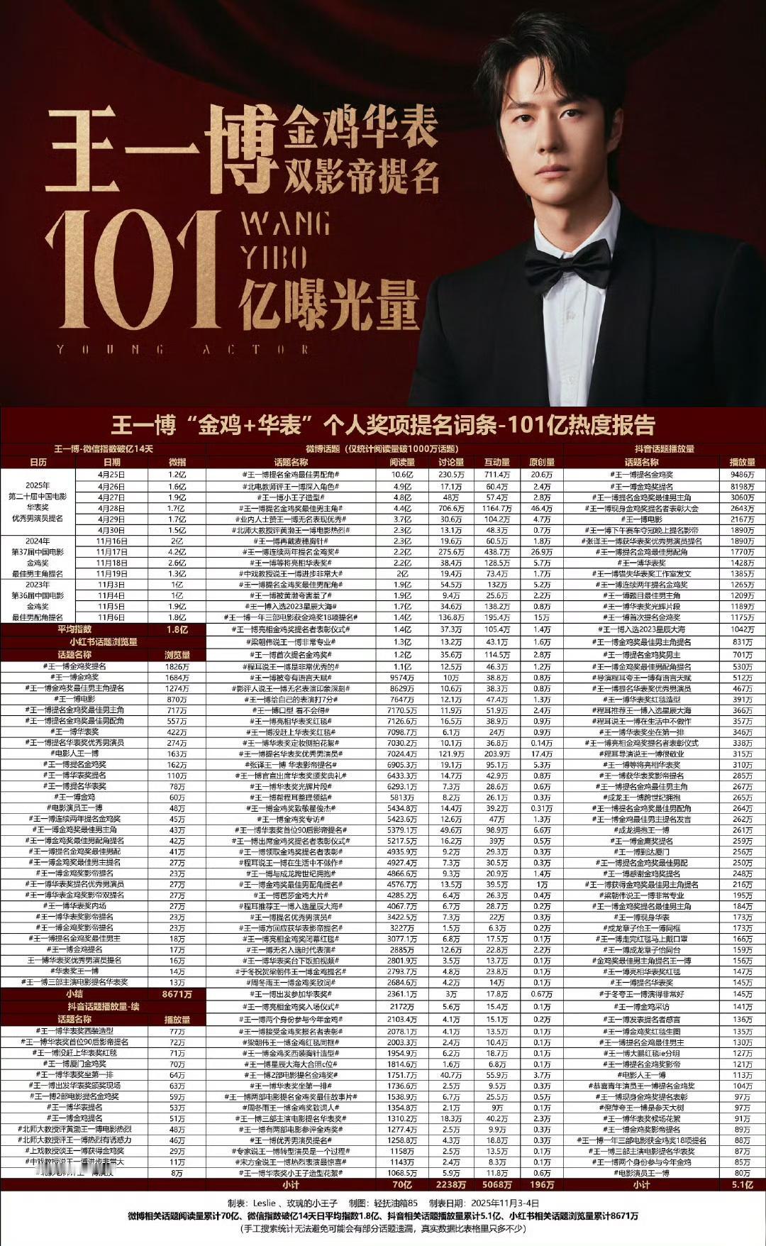 2023年王一博凭借第一部主演电影《无名》便获得金奖最佳男配角提名! 2024年王一博凭借主演电影《热烈》获得金鸡奖最佳男主角提名,且是95后首位金鸡奖影帝提名! 2025年王一博再次凭《热烈》获得华表奖优秀男演员提名,且是90后首位华表奖影帝提名! 这个时间跨度,仅仅只用了从2023-2025两年的时间,金鸡、华表双影帝提名。 王一博“金鸡+华表”双影帝提名时的百亿曝光: 💚微指14天破亿平均指数1.8亿; 💚wb主话题累计阅读量70亿; 💚dy主话题累计播放量5.1亿; 💚xhs相关话题累计浏览量破8671万。 只能说,巨星的光芒,就是如此耀眼,真正的天赋和实力就是如此让人折服。 从爱豆到演员到影帝提名,王一博的的确确“在蜕变中成长,绽放中国电影的希望之光”!