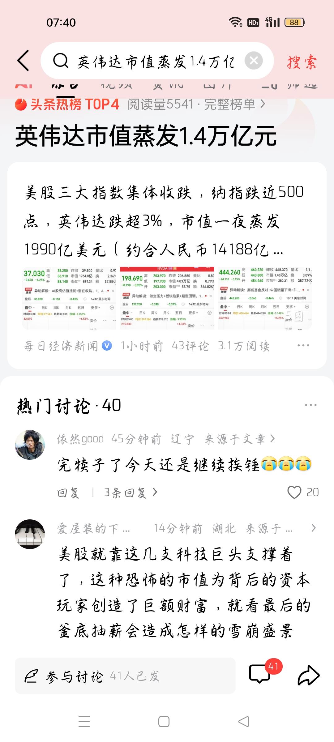 英伟达市值蒸发1.4万亿元,我想说 据每日经济新闻报道,美股三大指数集体收跌,纳指跌近500点,英伟达跌超3%,市值一夜蒸发1990亿美元(约合1.4万亿元),那么为什么英伟达跌得这么凶呢?个人认为,英伟达是Al科技企业,前一段时间美股市场炒作科技股,科技股普涨,而英伟达作为科技股的龙头企业之一,前期涨幅过大,股价偏离了股的估值,捧得多高,就是摔得越凶,因为炒作的人要获利了结,加上不少投资评估机构的预警,肯定的是英伟达股价下跌,当然市值也就蒸发了那么多。我分析得对吗?欢迎评论。