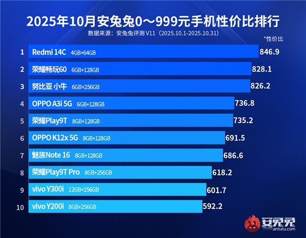 安兔兔10月安卓性价比榜(双11版)出炉,REDMI 14C 395.1元登顶百元档。
