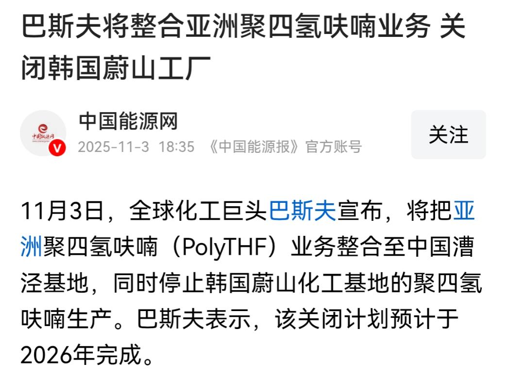 [微风]11月3日,巴斯夫宣布,将把亚洲聚四氢呋喃(PolyTHF®)业务整合至中国漕泾基地,同时停止韩国蔚山化工厂的生产,并计划于 2026 年前完成关闭。 这个消息来得突然,却又似乎在情理之中,它不仅仅是一个工厂的关闭,更像是一个风向标,预示着某些深层次的产业变迁正在发生。 韩国媒体和业界瞬间“不淡定了”,各种解读和担忧甚嚣尘上。 要理解巴斯夫这步棋的深意,我们得先搞明白聚四氢呋喃到底是个什么东西。听起来很化学,很专业,但它其实就藏在我们生活的方方面面。你穿的弹性瑜伽裤、运动服,里面那种叫“氨纶”的纤维,它的关键原料之一就是聚四氢呋喃。 你手机上那个手感不错的保护壳,或者脚上那双耐磨的鞋底,很可能也含有它的下游产品——聚氨酯。可以说,这是一种连接着纺织、汽车、电子消费品等众多行业的“隐形冠军”材料。 巴斯夫作为全球领先的供应商,它把这块业务放在哪里,哪里就意味着能更紧密地接触到这些庞大的下游市场。 那么,问题来了,为什么是中国,而不是韩国?企业做决策,尤其是这种涉及数百亿投资和数千人就业的重大调整,从来都不是拍脑袋的决定,而是冷静到近乎残酷的“用脚投票”。第一个绕不开的因素,就是市场需求。这听起来像是句废话,但市场的“体量”和“活力”却是天差地别。 中国如今是全球最大的制造业中心,也是全球最大的消费市场之一。从服装鞋帽到新能源汽车,再到各种电子产品,这些消耗聚四氢呋喃的产业,其产能和增长的重心早已坚定不移地移到了中国。 把工厂放在中国,意味着你的客户就在隔壁,物流成本大大降低,供应链响应速度却能成倍提升。对于化工这种讲究“规模效应”和“稳定供应”的行业来说,能够贴身服务一个增长迅猛且体量巨大的市场,其诱惑力是难以抗拒的。 蔚山工厂虽然也曾是巴斯夫在亚洲的重要布局,但它面对的,终究是一个相对饱和且增长空间有限的韩国本土市场,以及需要远途运输的海外市场。此消彼长之下,天平的倾斜显而易见。 但仅仅靠近消费者,就足以让一个化工巨头做出如此重大的战略收缩吗?答案显然不止于此。这背后,更深层次的原因在于“产业链协同”这个魔法般的词汇。这才是巴斯夫真正“拥抱”中国的核心。 这里就不得不提巴斯夫在中国的另一个超级项目——位于广东湛江的一体化基地。这个基地总投资高达100亿欧元,是巴斯夫迄今为止最大的单笔海外投资,它不是一座孤立的工厂,而是一个庞大的、自我循环的“化工城”。 在这个体系里,一个装置生产出来的副产品或废料,可以立刻通过管道输送到下一个装置,成为它的原料。这种“ Verbund”(德语,意为“一体化”)理念,能最大限度地降低能耗、减少排放、节约成本,形成1+1远大于2的竞争优势。 现在,把聚四氢呋喃业务整合到漕泾,就不仅仅是靠近客户那么简单了。漕泾基地本身就是一个成熟的化工园区,同样具备强大的产业链整合能力。聚四氢呋喃的生产需要上游的原料,比如四氢呋喃(THF)和1,4-丁二醇(BDO)。 在中国,这些上游原料的供应网络极为发达,并且正在与新能源等新兴产业链深度融合。比如,BDO的生产可以与生物基材料或者绿氢产业结合,这在全球“碳中和”的大背景下,代表着未来的方向。 巴斯夫将业务集中于此,就等于把自己接入了一个更庞大、更高效、更具未来想象力的产业生态系统。它不再是一个单打独斗的选手,而是加入了一个强大的“联盟”。相比之下,蔚山工厂虽然在韩国国内也算得上是重要基地,但在这种全球化的产业链整合大潮面前,就显得有些“孤军奋战”了。 这起事件,就像一面棱镜,折射出中韩两国在高端制造业领域竞争格局的微妙变化。曾几何时,韩国在化工、半导体、显示面板等领域,都是中国追赶的目标。 但如今,中国的崛起速度超出了许多人的预期。凭借着巨大的市场腹地、完整的工业门类、持续不断的技术投入以及强大的政策支持,中国正在从“世界工厂”向“世界创新中心”和“全球产业链核心枢纽”转变。巴斯夫的选择,正是对这一趋势的确认。它不是第一个这样做的跨国公司,也绝不会是最后一个。 对于韩国来说,这无疑是一记响亮的警钟。当曾经的“优势”逐渐被“规模”和“生态”所覆盖时,韩国产业界需要思考的,是如何在新的赛道上找到自己不可替代的位置。是继续在存量市场里内卷,还是另辟蹊径,在更尖端、更具独创性的领域实现突破? 当然,这并不意味着韩国化工产业的末日。韩国在许多精细化工品和高端材料领域,依然拥有深厚的技术积累和品牌优势。 但巴斯夫的离去,无疑撕开了一个口子,让人们看到了产业空心化的潜在风险。这不仅仅是几百个工作岗位的问题,更关乎整个国家产业链的稳定性和未来的发展潜力。当资本和技术开始用最直接的方式做出选择时,任何情绪化的反应都显得苍白无力