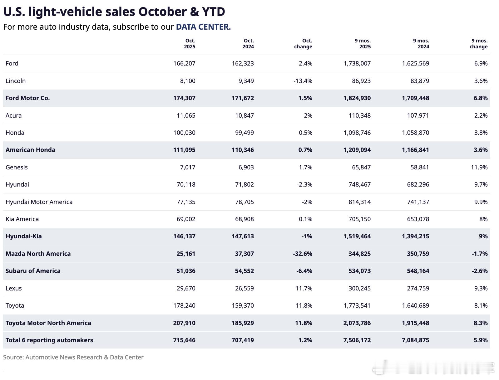 日系在美国还是非常厉害的,丰田和雷克萨斯的10月销量增长了 12%,丰田品牌的SUV增长了 26%。但是纯电车型丰田 bZ4X 暴跌 99%,雷克萨斯 RZ 上个月交付量下降了 96%。
