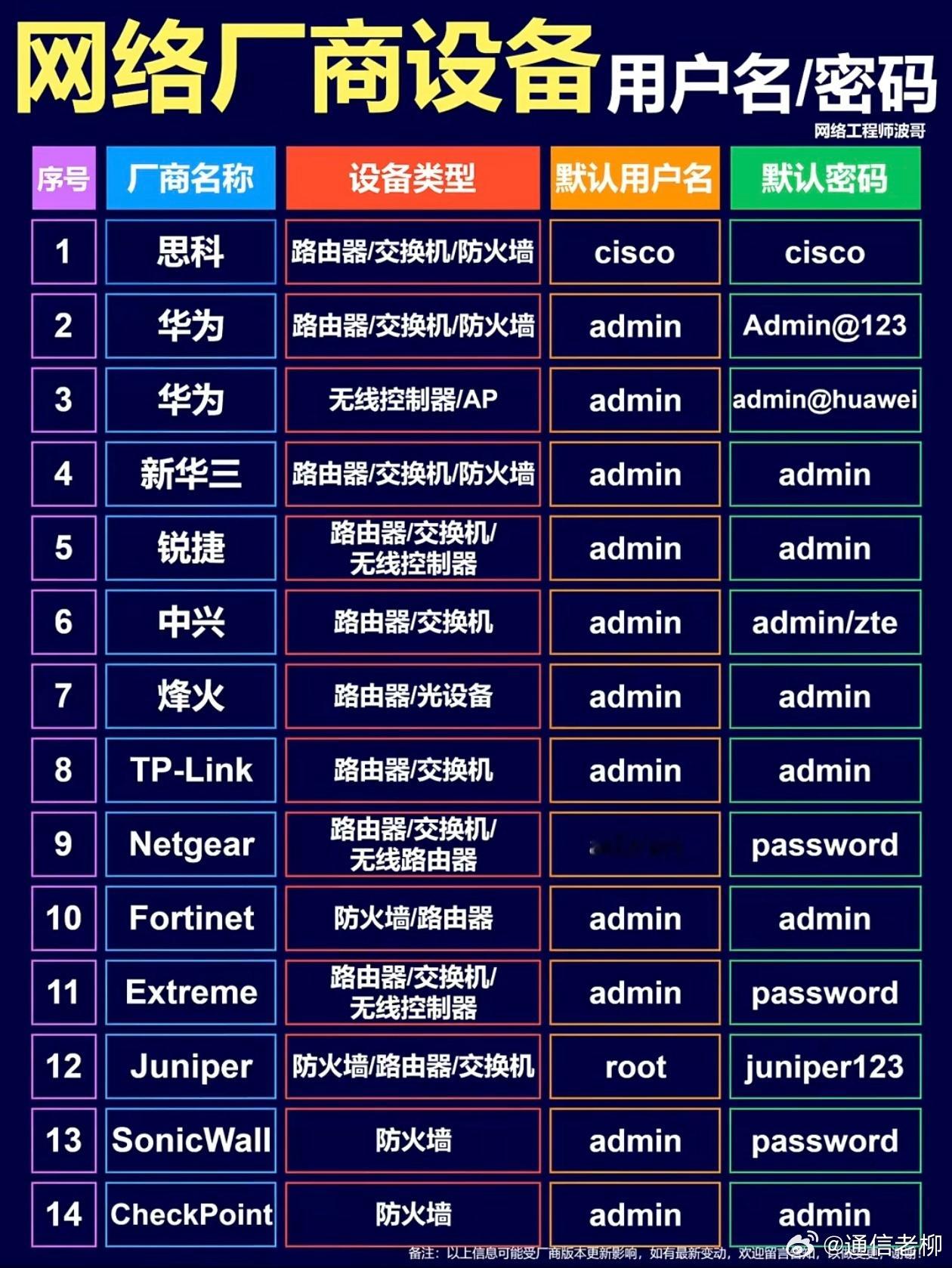 不同网络厂商的路由器交换机的常用默认用户名和密码!