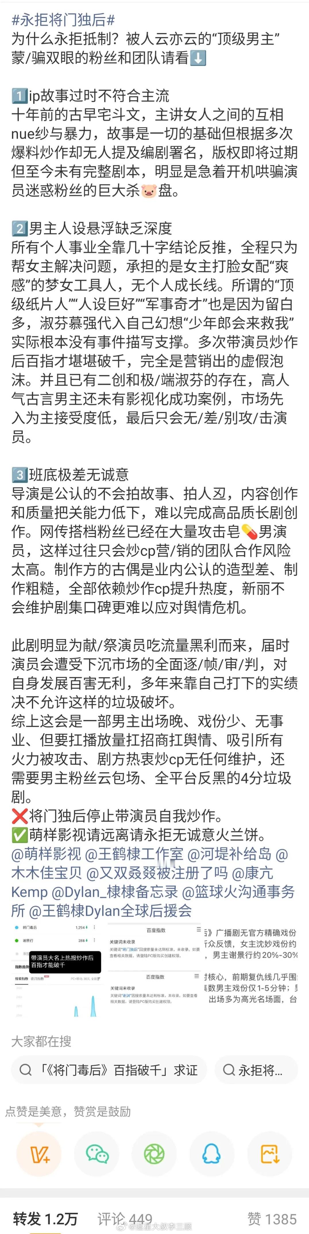 王鹤棣粉丝拒🫓《将门毒后》万转博文,说的挺中肯的