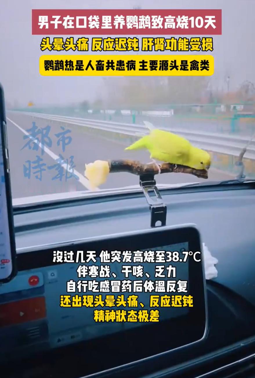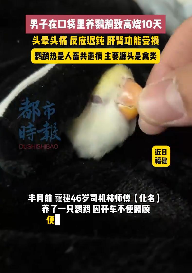 福建,一男子养了只鹦鹉,平时喜欢的不行,可由于自己是出租车司机,不能天天在家照顾,就干脆直接把鹦鹉随身带着,放进兜里有时间就摸一摸,谁知前不久身体突然发生不适,去医院检查,才知道患上了鹦鹉热衣原体 据悉,林师傅今年46岁,平时开出租,路上时间长,没办法经常在家照顾宠物,就想着把小鹦鹉揣在胸口口袋里,有空就摸一摸、逗一逗。那只鹦鹉对他也挺黏人,一人一鸟就这么形影不离 可没几天,他开始觉得不对劲,先是发高烧、头晕、全身没劲,后来连反应都变慢了。家人赶紧把他送去医院,一查才发现肝肾功能都出问题。医生再仔细问病史,才知道他一直把鹦鹉揣在身上,最终确诊为鹦鹉热衣原体感染 这种病其实并不罕见,主要通过吸入鸟类的分泌物或羽毛粉尘传播。对普通人来说,除非密切接触,很少中招,但像林师傅这种“随身带”的做法,就等于每天在和病原面对面。鹦鹉外表再干净,它的粪便或羽毛上也可能携带细菌。尤其天气热、空气不流通,密闭环境里更容易被吸入 很多人养鸟养宠物,都觉得只要自己喜欢、愿意花时间陪伴,就是对它们好。但这个事说明了一个问题,就是爱宠物,也要懂方式 养任何动物之前,最好先做点功课。了解它们的习性,知道可能存在的健康风险,并做好卫生防护。比如养鸟要常清理笼子、保持环境通风、接触后洗手,这些小事能大大降低感染几率