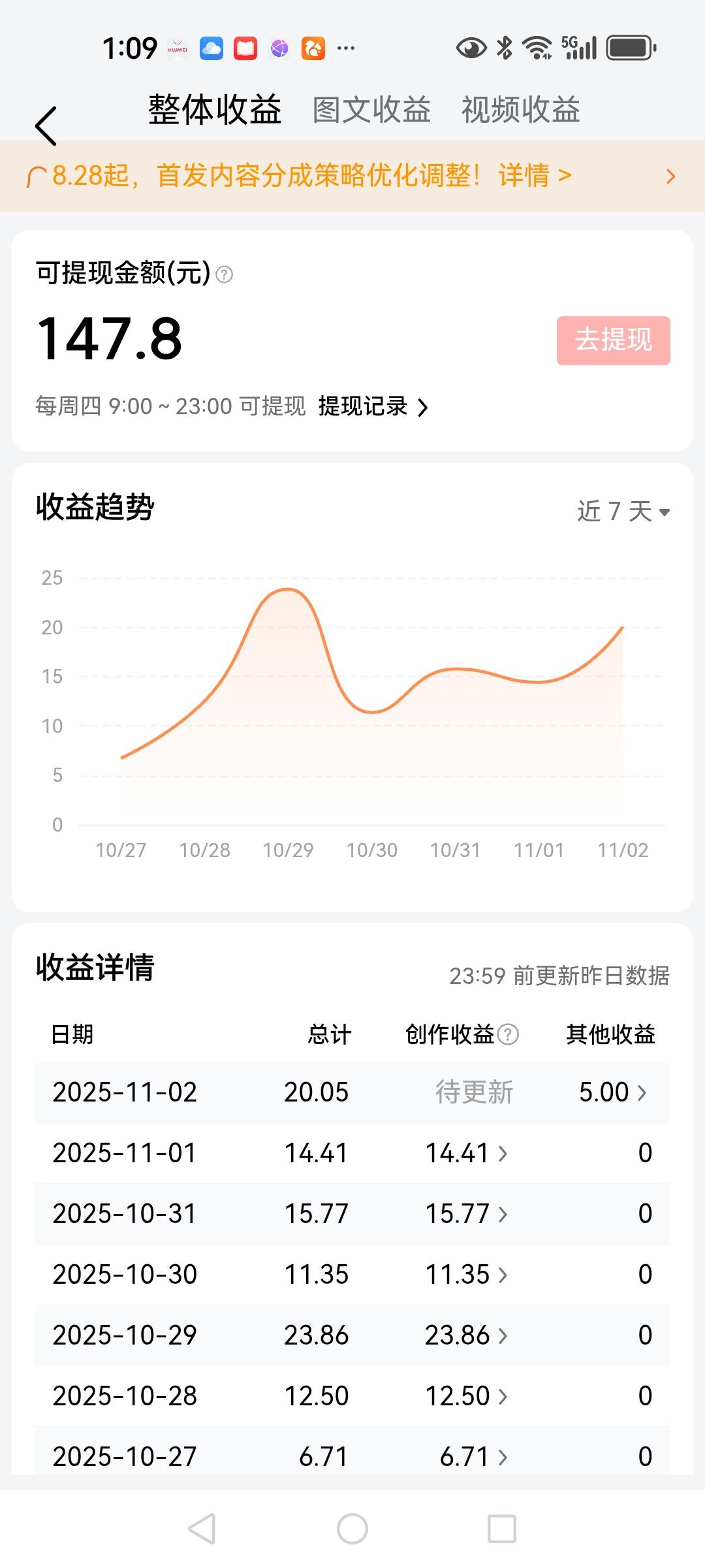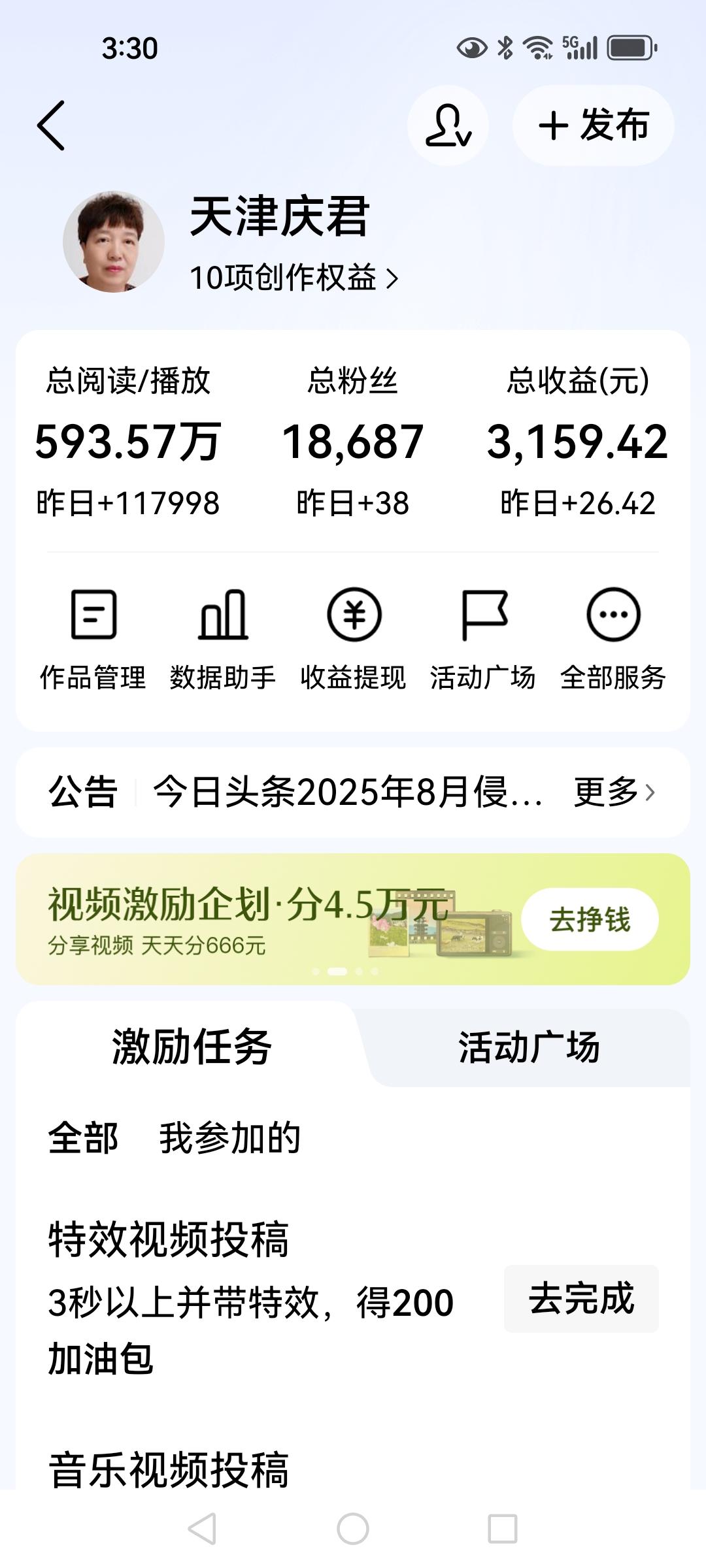 创自己记录的成绩 一个星期发了83个内容,59万阅读量,新增加粉丝231人,新增点赞588个,新增评论1520条,新增收藏528个。 其中84人通过官方推荐入口关注我。 同时还有147人通过我的原创作品关注了我。 累计获得102,29的收益和600加油包。 这是我入住平台5一6年来,一周的最佳成绩。创作真的真的不易,克服自身年龄大,身体弱的因素,坚持创作,在看别人和学习别人作品的同时,也让别人看我和学习我的作品。 从中获得充实,完美自己,脱离世俗。(少与亲戚,朋友,邻居接触) 夕阳无限好,创作少不了。 平台来作伴,充实又快乐。