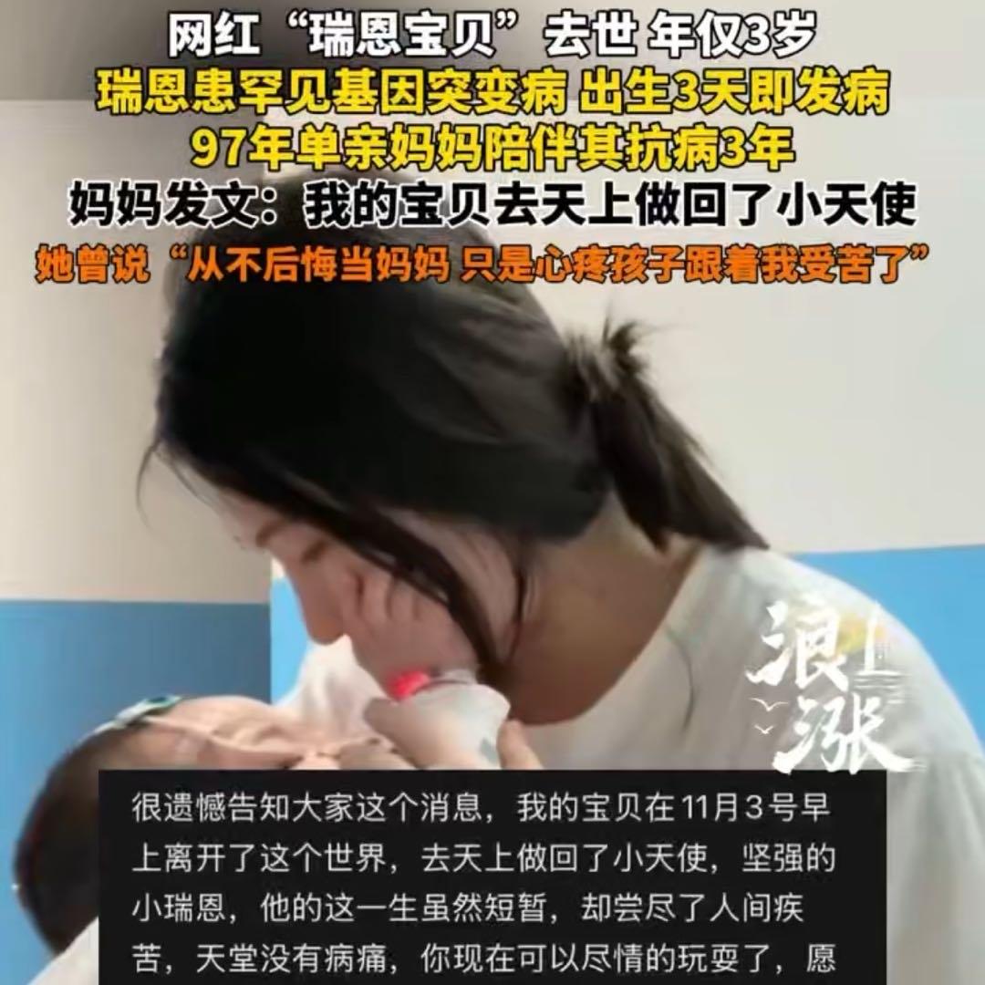 最近,一个叫瑞恩宝贝的小网红走了,才三岁。这消息一出来,好多人都跟着难受,心里沉甸甸的。 瑞恩宝贝出生才三天,就突然窒息,口唇发紫,呼吸都停了,把家里人都吓坏了。在广西的妇幼保健院,医生发现他癫痫发作得特别厉害,一天能抽几十次,可就是查不出啥原因。后来转到广西医科大学第一附属医院,做了基因检测,才知道他得的是全球都没几例的早期婴儿型癫痫性脑病47型,就是FGF12基因突变。这病让他的脑神经元老是异常放电,癫痫发作个不停,脑子也受了不可逆的损伤。 这三年来,瑞恩宝贝一直在跟病魔斗。他试过各种治疗,吃药、生酮饮食、重复经颅磁刺激、迷走神经刺激,啥都试了,可就是没啥用。他两岁多了还只能躺着,不能自己坐起来,吃饭也得靠鼻饲管,瘦得皮包骨,身上还老是因为抽搐青一块紫一块的。他妈妈,一个97年的单亲妈妈,一直陪着他,给他擦嘴角,给他鼓励,说“瑞恩别怕,阳光照不到的地方有妈妈”。这画面,想想就让人心疼。 瑞恩宝贝的故事,不只是他一个人的事儿,它让咱们看到了罕见病家庭的难。你知道吗,咱们国家有2000多万罕见病患者,可70%都得不到有效治疗。治疗罕见病的医生,比患者还少,全国都不到3000人,还都集中在大城市。瑞恩妈妈带着他到处看病,南宁、广州、上海,每次都得提前一周预约,路途颠簸,还怕病情恶化。更让人无奈的是,FGF12基因突变这种超罕见的病,国内还没药,只能盼着国际临床试验。 瑞恩宝贝走了,但他给咱们留下了好多。他妈妈签了遗体捐献协议,把他的脑组织样本给了科研机构,希望他的痛苦能换来其他孩子的希望。复旦大学附属儿科医院还用他的样本建了全球首个FGF12基因突变细胞模型,给开发靶向药物打下了基础。这爱,真的超越了血缘,让医学界看到了攻克罕见病的新可能。 瑞恩宝贝的故事,也让咱们开始想,罕见病保障体系到底咋样。国家医保局虽然把7种罕见病用药纳入了报销范围,可年治疗费用还是高得吓人,普遍超过30万。专家说,得建个“政府主导+商业保险+社会救助”的多层次保障机制,还得加快罕见病立法,从制度上保障患者权益。 瑞恩宝贝走了,可他的抖音账号成了罕见病群体的精神家园。他教会了咱们珍惜每一口呼吸,也让咱们看到了对抗绝望最有力的方式——在至暗时刻点燃星光,让后来者看见希望。 大家说说,咱们能为罕见病群体做点啥?是捐款、宣传,还是推动政策完善?快来评论区聊聊,让咱们的爱和力量,汇聚成一股暖流,温暖这些在黑暗中挣扎的家庭。宝宝离世 婴儿癫痫 网红“瑞恩宝贝”去世 年仅3岁