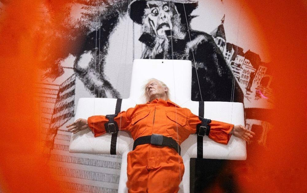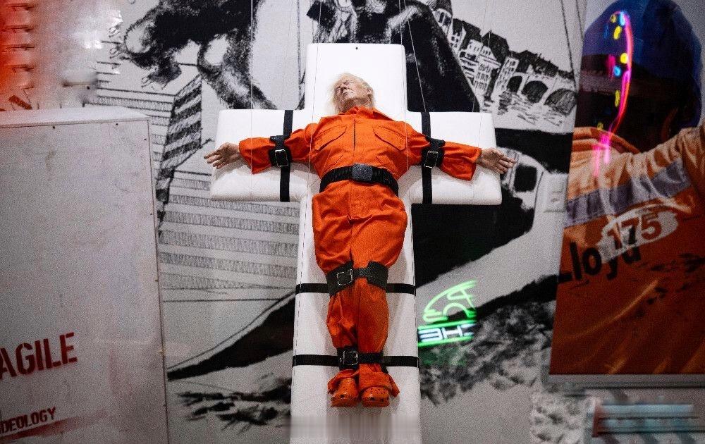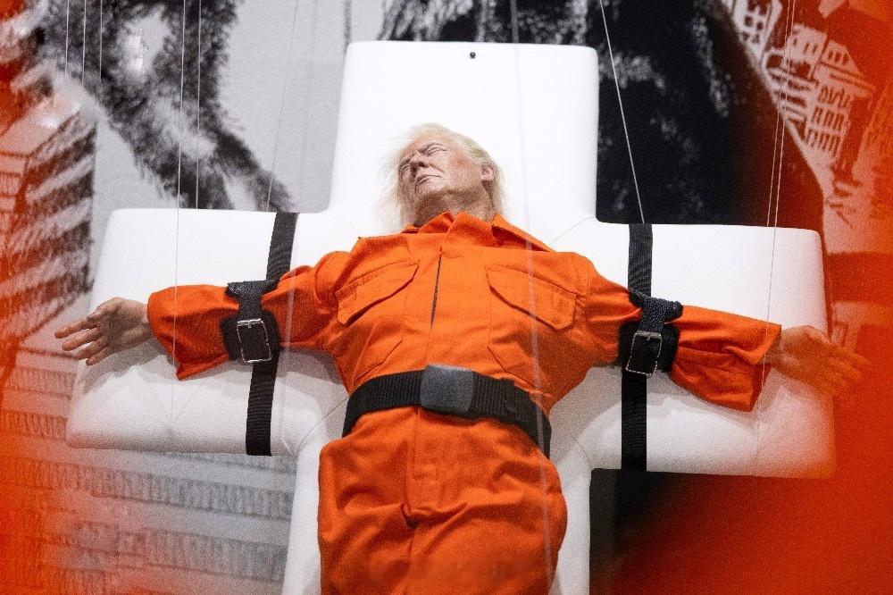 一尊栩栩如生的特朗普雕塑,身穿橙色连体服,被绑在十字架上,本周在瑞士展出,引发了热议。