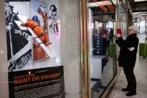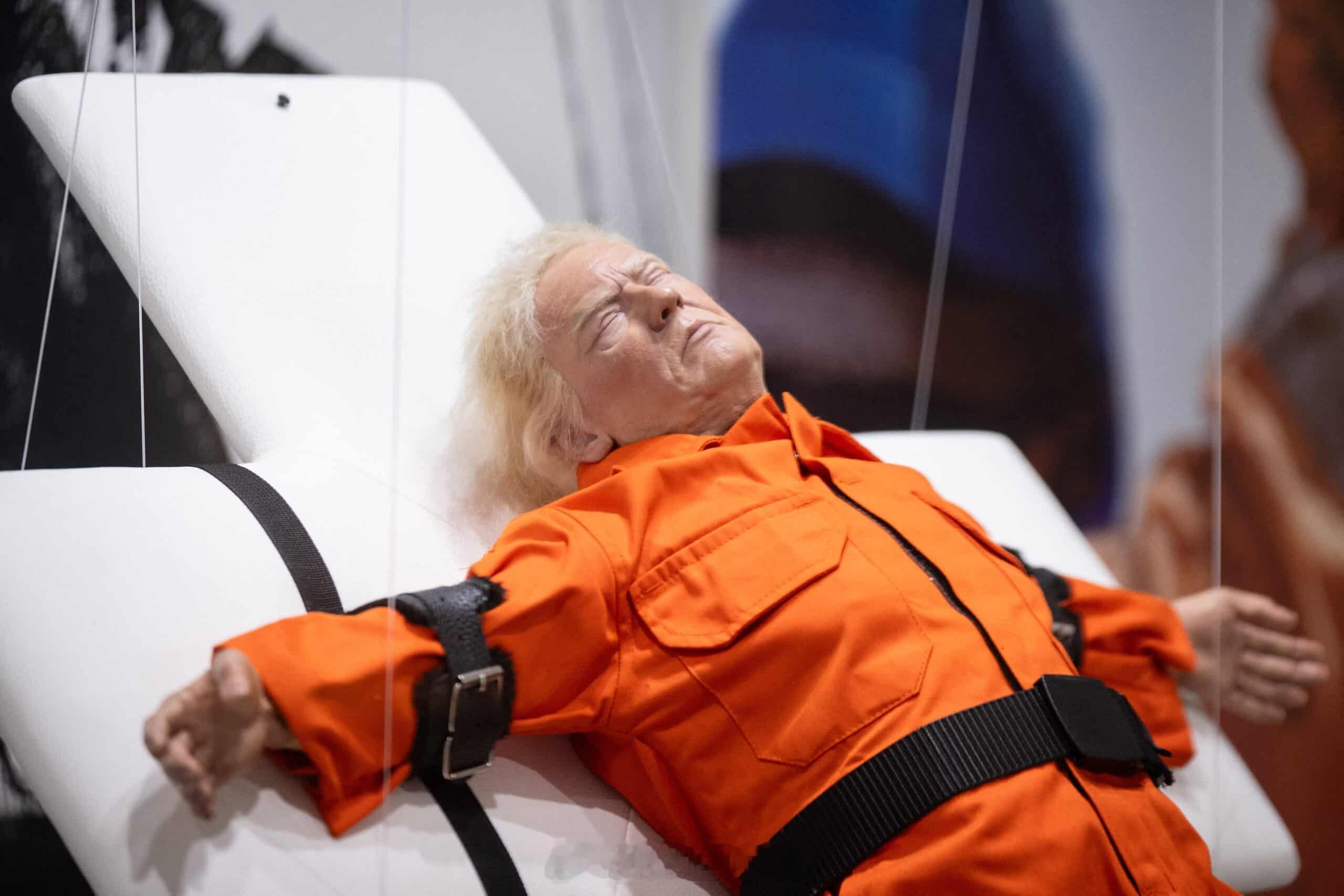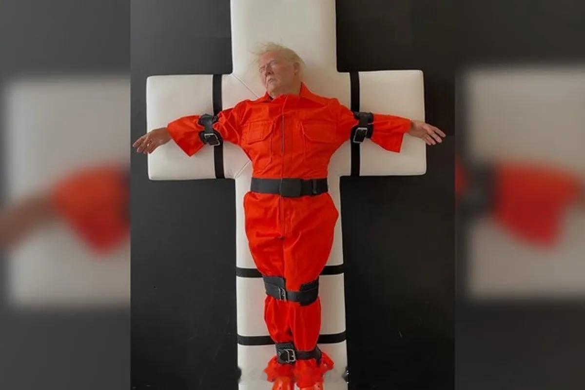 一尊栩栩如生的特朗普雕塑,身穿橙色连体服,被绑在十字架上,本周在瑞士展出,引发了