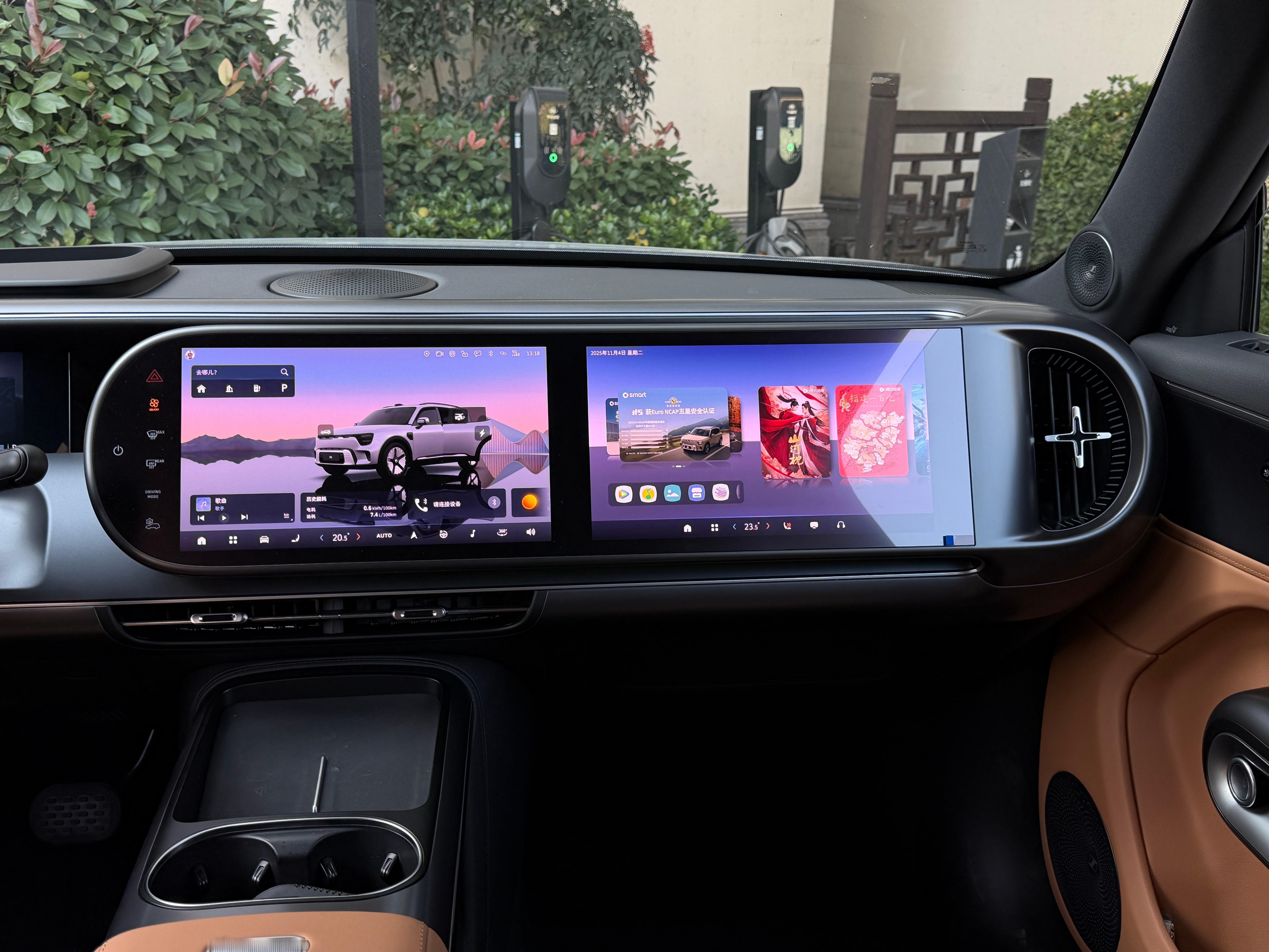 车内软质包覆率达85%,大量使用Nappa真皮和仿皮材质,搭配缝线工艺,质感细腻。10.3英寸全液晶仪表盘与双13英寸OLED联屏显示清晰,还可选装AR增强型抬头显示,信息读取方便。车机搭载AMD V2000桌面级芯片,操作流畅,并集成豆包AI大模型,语音交互功能强大;