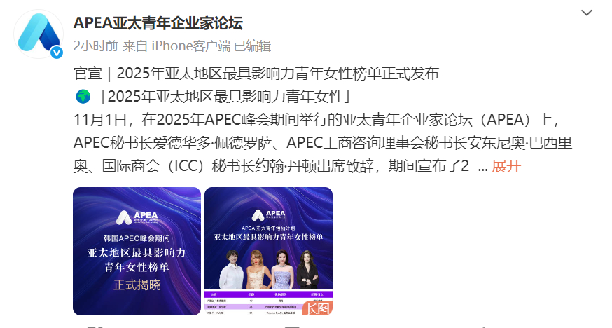 刚刚,APEA亚太青年企业家论坛发布了2025亚太地区最具影响力女性榜单,以表彰在亚太地区经济与社会进步中展现卓越领导力和创新精神的青年精英(图3)。