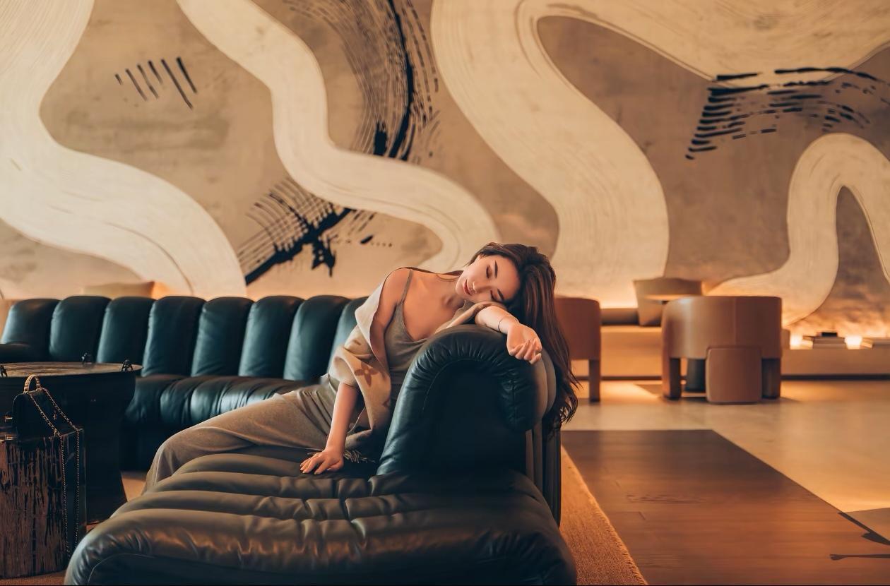 在宁静的竹林中,她优雅地坐在木制台阶上,仿佛与自然融为一体。
