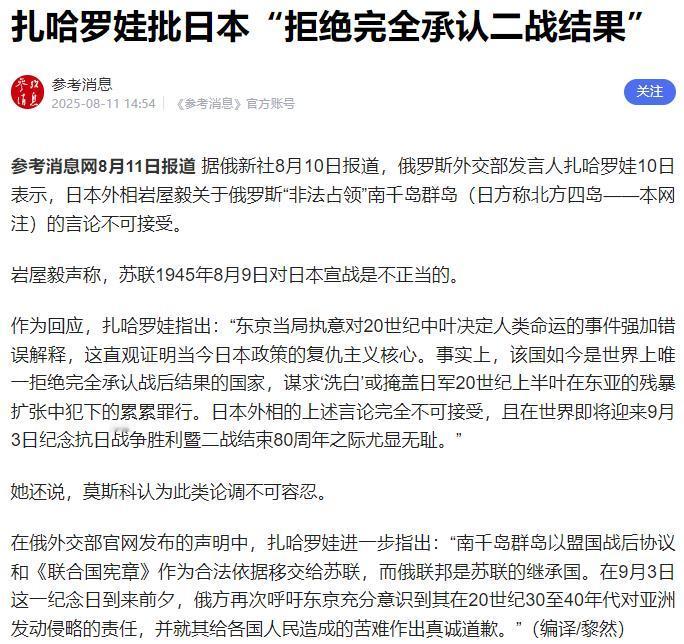 俄罗斯外交部发言人扎哈罗娃直戳要害,说日本是唯一不完全承认战败的国家,还在试图抹