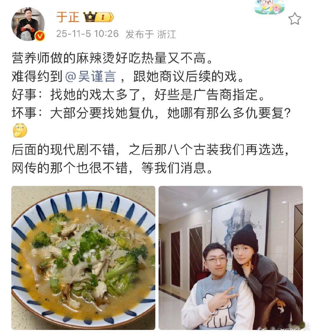 于正说跟吴谨言商议后续的戏于正称找吴谨言的戏太多了于正和吴谨言这波操作,谈后续的戏,还说吴谨言现在戏太多了,广告商也抢着指定,就是大多是复仇戏,她哪来那么多仇啊。