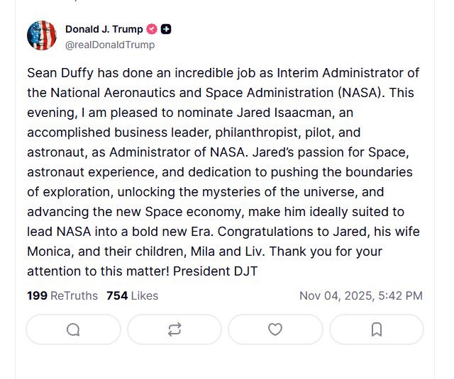 特朗普重新提名“贾里德·艾萨克曼”担任美国宇航局(NASA)下一任局长