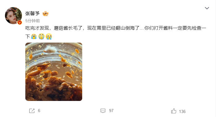 张馨予提到打开酱料前必须检查,源于蘑菇酱长毛的亲身经历,用真实案例传递生活安全知识。张馨予打开酱料一定要先检查一下张馨予的蘑菇酱长毛了