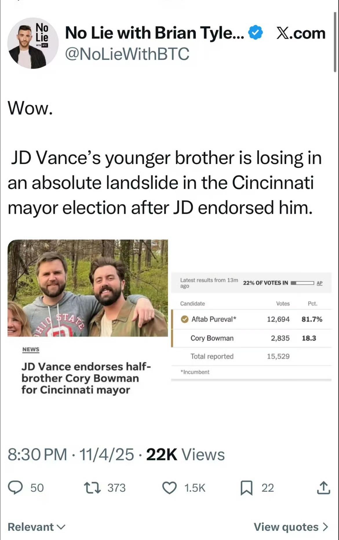 瘟神,万斯的弟弟在万斯宣布支持他后,以断崖式惨败输掉了辛辛那提市长选举,足足输了63.4%。[抠鼻]