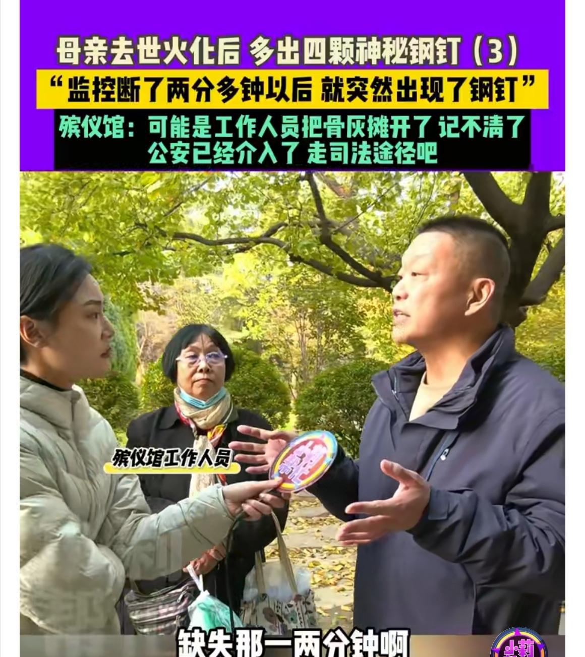 【奇怪!老人火化后骨灰现钢钉,家属质疑:不是我妈?】 近日,新乡市一殡仪馆发生了一件让人费解的事——一位母亲不幸去世,本是平常的一次火化,没想到出炉的骨灰里竟然多出了4颗钢钉!家属顿时懵了,因为老人去世前没做过任何植入手术,那钢钉又是从哪冒出来的? 更离奇的是,据家属说,监控录像偏偏在关键的两分多钟内断开,之后这些神秘钢钉就“突然冒出来”,让大家不得不怀疑,这骨灰是不是被调包了?还是现场有什么操作没人知道? 殡仪馆方面倒也很坦诚,表示他们对这些钢钉的出现也是一头雾水,目前也解释不了。眼见事件越闹越大,公安部门已经介入调查,将彻查这背后的原因。不少网友看到消息后也纷纷热议,有的担心自己的亲人火化时会不会遇到类似问题,有的呼吁要加强殡仪馆管理、保证流程透明。 此事提醒我们,殡仪服务除了医疗水平,还得有足够的公开透明和规范管理,毕竟涉及逝者家属的情感,容不得半点马虎。真相究竟如何?希望相关部门尽快查明,给家属和社会一个负责任的答复。